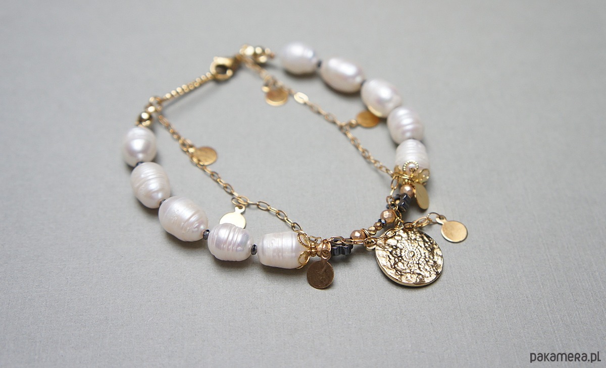 Bransoletka wykonana w całości naturalnych, słodkowodnych pereł [ok. 10-13mm], fasetowanych, platerowanych hematytów [2 i 3mm], przekładek z hematytu [1mm oraz kwiatki 6mm] oraz z pozłacanej stali szlachetnej. Całkowita długość bransoletki ok. 20,5cm.