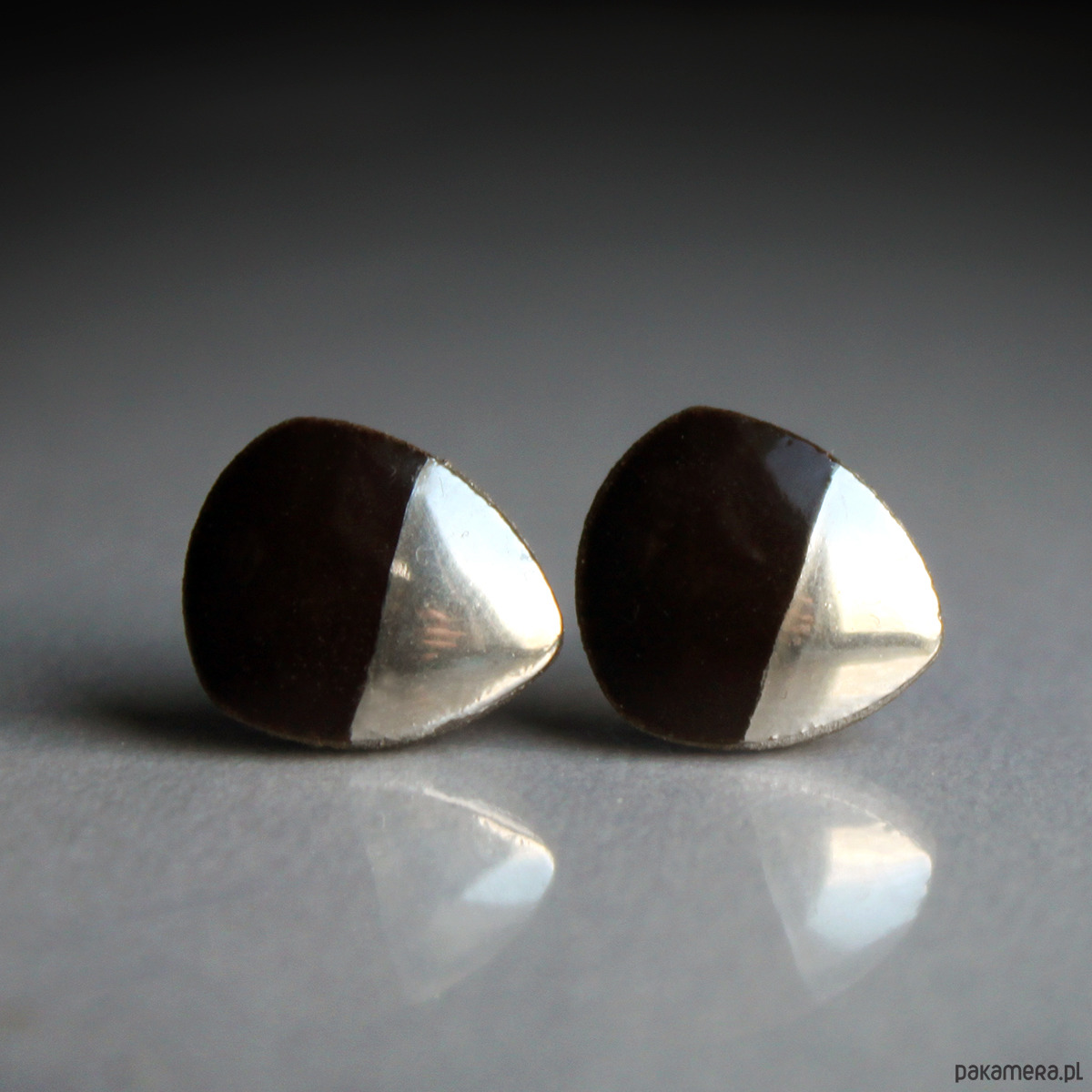Ceramiczne kolczyki w formie sztyftów, ręcznie wykonane z delikatnej kamionki, jednostronnie szkliwione mieszanką czekoladowo brązowych szkliw i dekorowane platyną, na sztyftach w kolorze srebrnym. Średnica ok. 13mm. Polecam