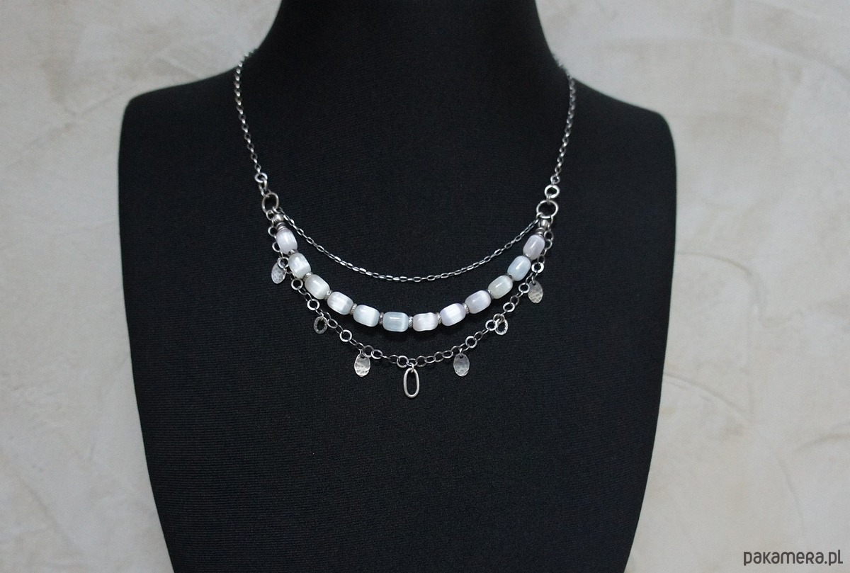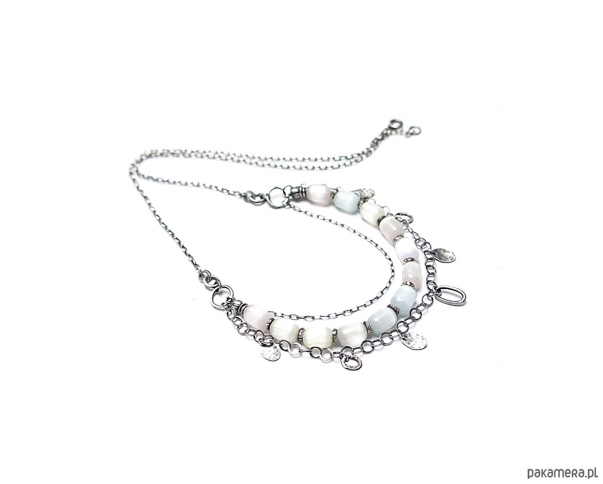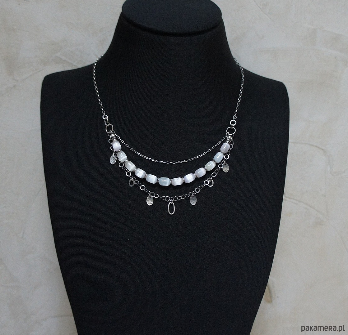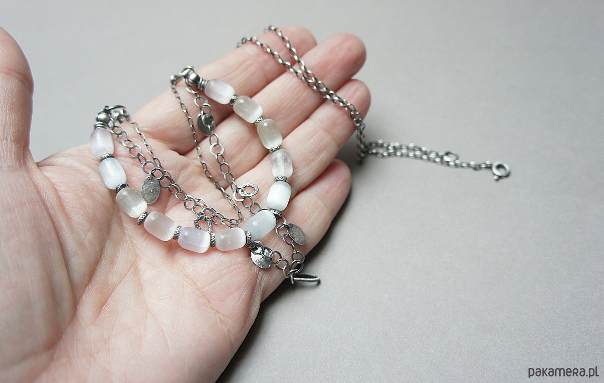 Naszyjnik trzyrzędowy wykonany ze srebra [pr. 925] w połączeniu z unikatowymi oliwkami selenitów [10mm -kamienie lekko pastelowe] Selenit jest ceniony w ezoteryce za właściwości oczyszczające aurę i przestrzeń. Całość oksydowana i przetarta. Długość naszyjnika około 51,5cm [po najkrótszym obwodzie].