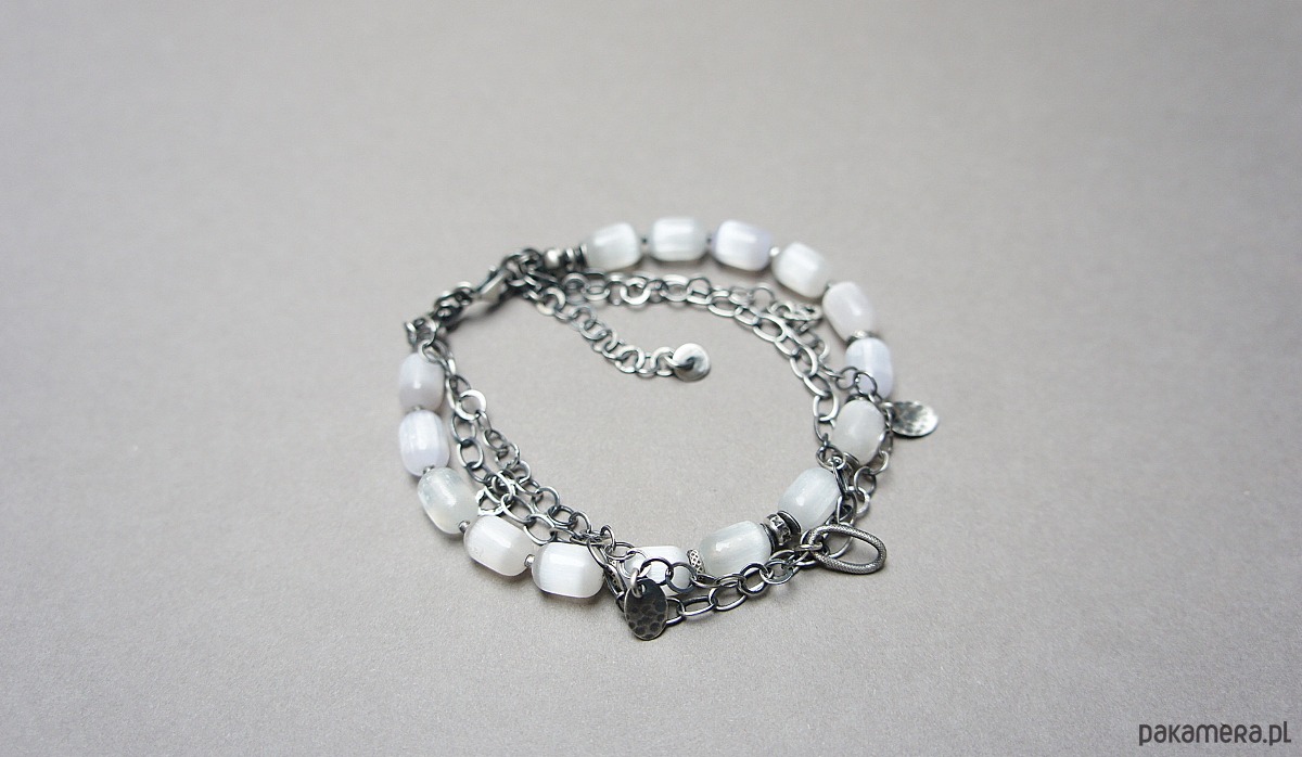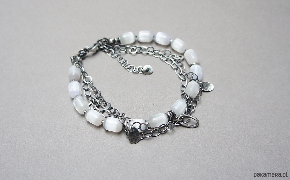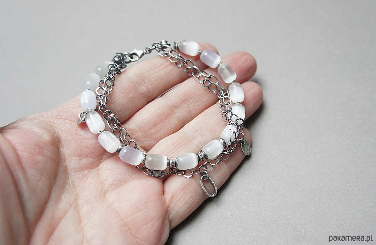 Bransoletka trzyrzędowa wykonana ze srebra [pr. 925] w połączeniu z unikatowymi oliwkami selenitów [10mm -kamienie lekko pastelowe] .Selenit jest ceniony w ezoteryce za właściwości oczyszczające aurę i przestrzeń. Całość oksydowana i przetarta. Długość bransoletki 19,5 plus dodatkowe ogniwa i przedłużka.
