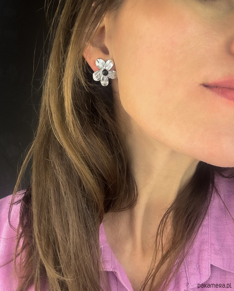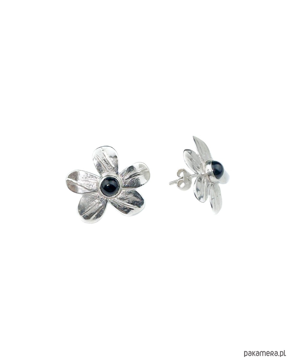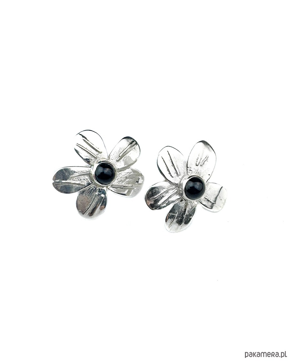 Kolczyki sztyfty, wykonane ręcznie ze srebra 925. Duże kwiaty z czarnymi onyksami w centralnej części.