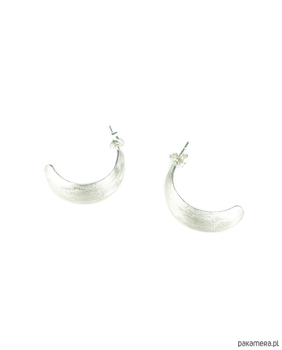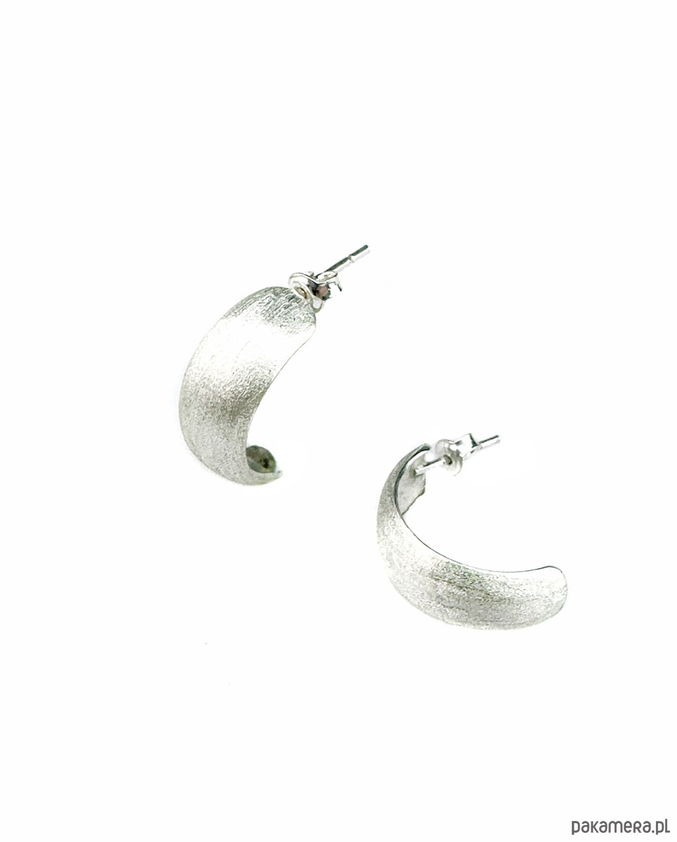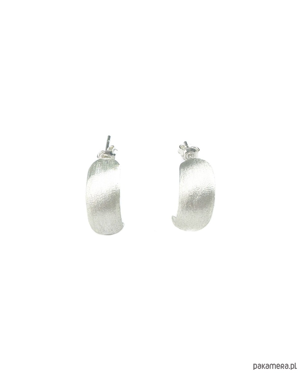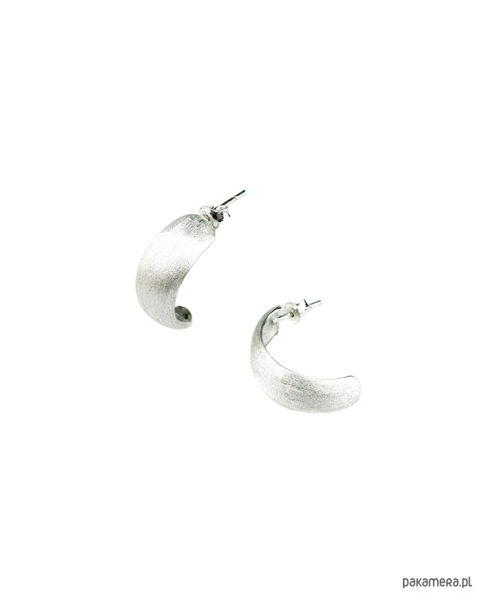 Szerokie, pękate, lekko zagięte kolczyki - sztyfty o satynowanej powierzchni. Wykonane zostały z cienkiej blaszki, dzięki czemu są lekkie i nie obciążają ucha. Srebro najwyższej próby -925. Dostępne również w wersji złoconej.