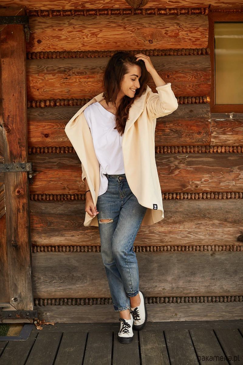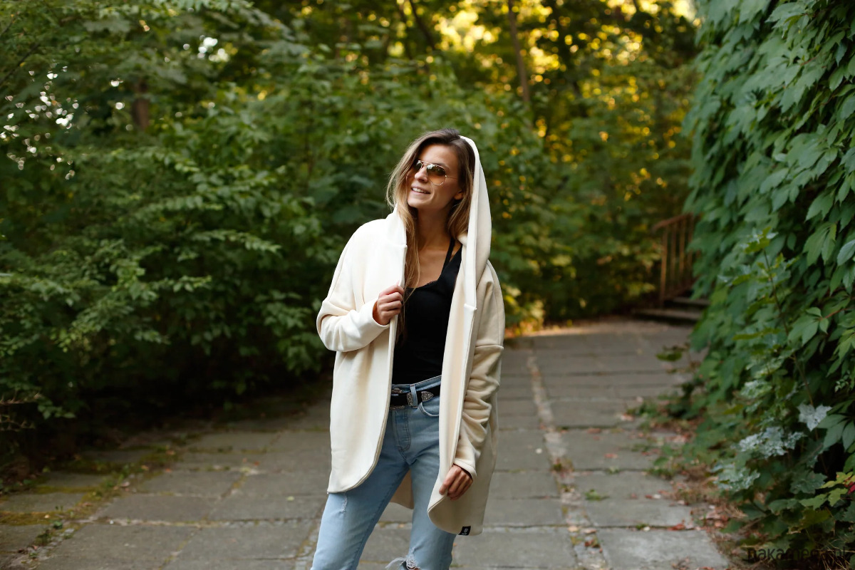 Naszą pelerynę możecie nosić od rana do wieczora, a mnogość stylizacji ogranicza tylko Wasza wyobraźnia. Do pracy, na spacer czy na wieczorne wyjście ze znajomymi – będzie pasować na każdą okazję. Cieszy nie tylko wizualnie, ale też swoją funkcjonalnością. Wyposażona jest w obszerny kaptur, głębokie kieszenie i dłuższy tył, co sprawia, że chcemy się w nią owinąć już teraz. Rozmiar jest uniwersalny i pasuje osobom, które noszą zazwyczaj XS, S, M lub L.