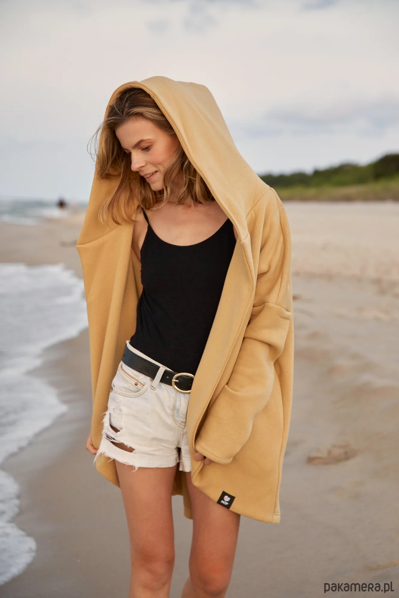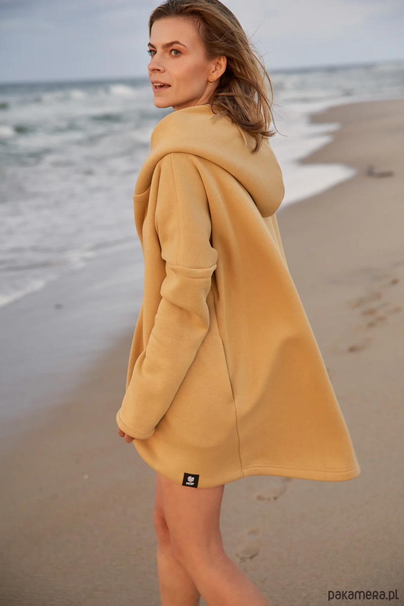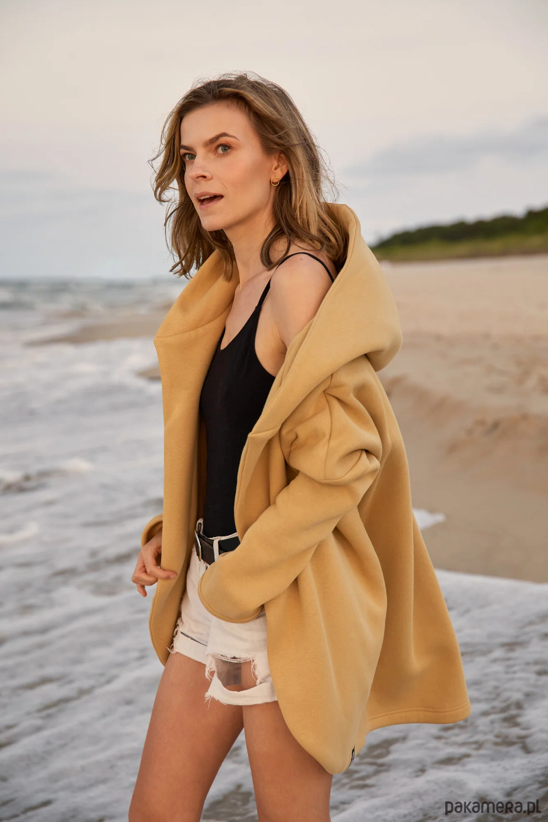 Naszą pelerynę możecie nosić od rana do wieczora, a mnogość stylizacji ogranicza tylko Wasza wyobraźnia. Do pracy, na spacer czy na wieczorne wyjście ze znajomymi – będzie pasować na każdą okazję. Cieszy nie tylko wizualnie, ale też swoją funkcjonalnością. Wyposażona jest w obszerny kaptur, głębokie kieszenie i dłuższy tył, co sprawia, że chcemy się w nią owinąć już teraz. Rozmiar jest uniwersalny i pasuje osobom, które noszą zazwyczaj XS, S, M lub L.
