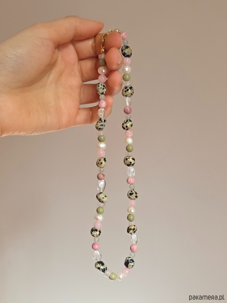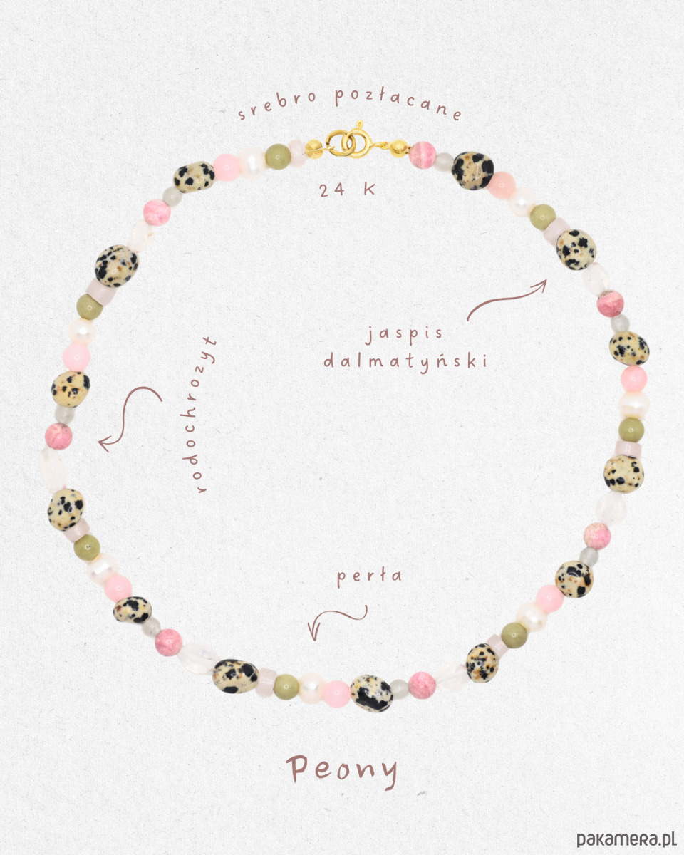 Peony to naszyjnik inspirowany delikatnością kwiatów i subtelną, wiosenną kolorystyką. Łączy w sobie naturalne kamienie o zróżnicowanej strukturze i spokojnej palecie barw, tworząc harmonijną, kobiecą kompozycję.