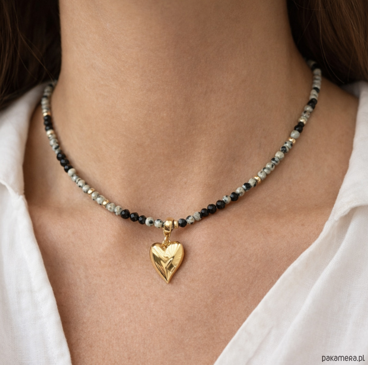 Odcienie beżu i czerni w połączeniu z elegancją srebrnych akcentów tworzą oszałamiający, a zarazem harmonijny naszyjnik z wypukłym, eleganckim sercem, który z pewnością przyciągnie spojrzenia. To biżuteria pełna klasy i subtelnej siły – wyważona, a jednocześnie wyrazista.