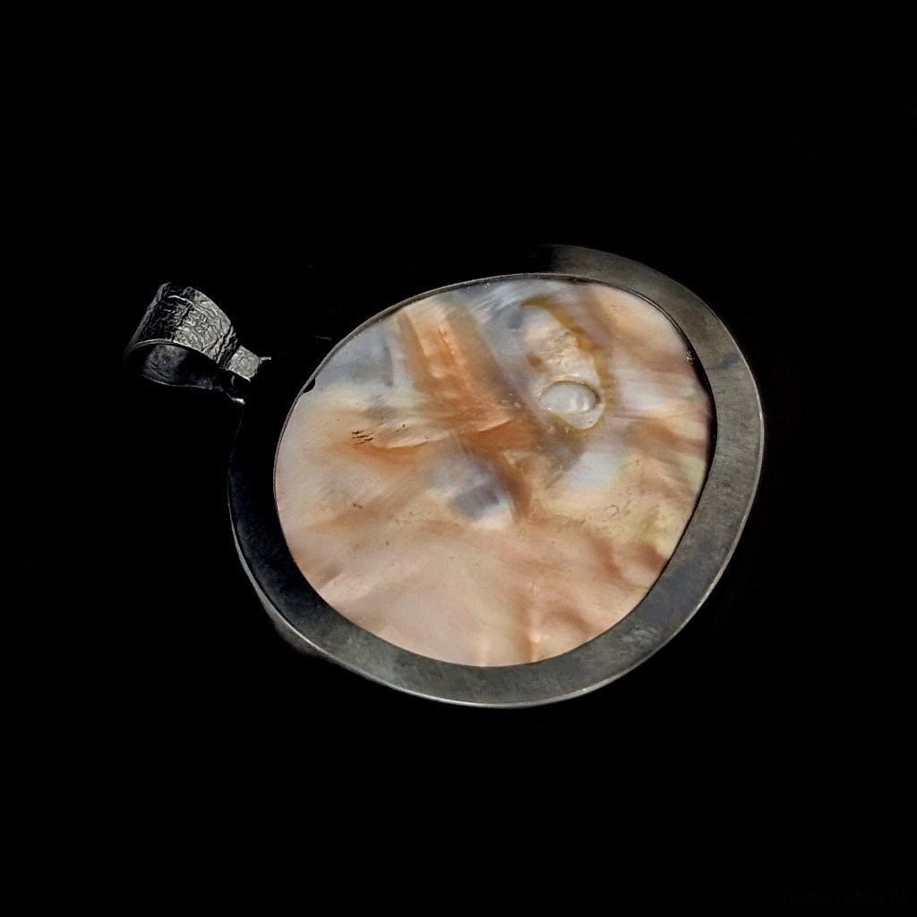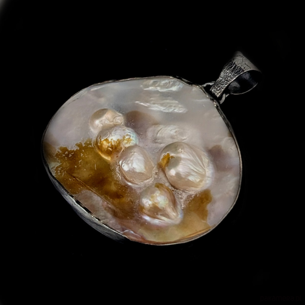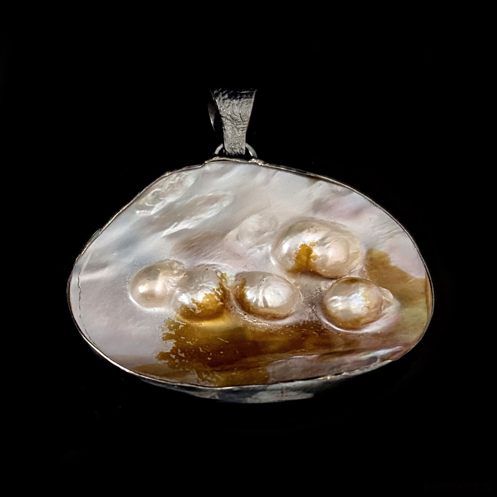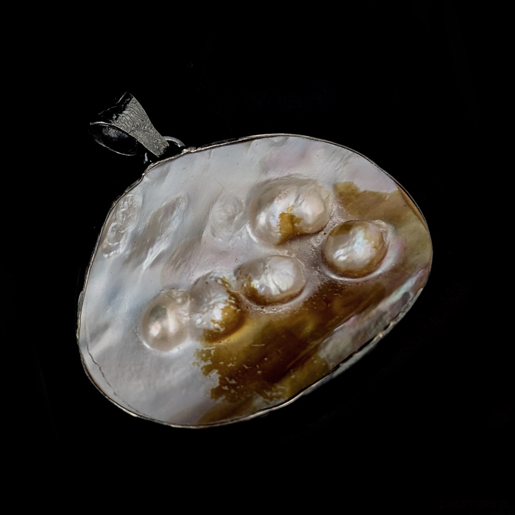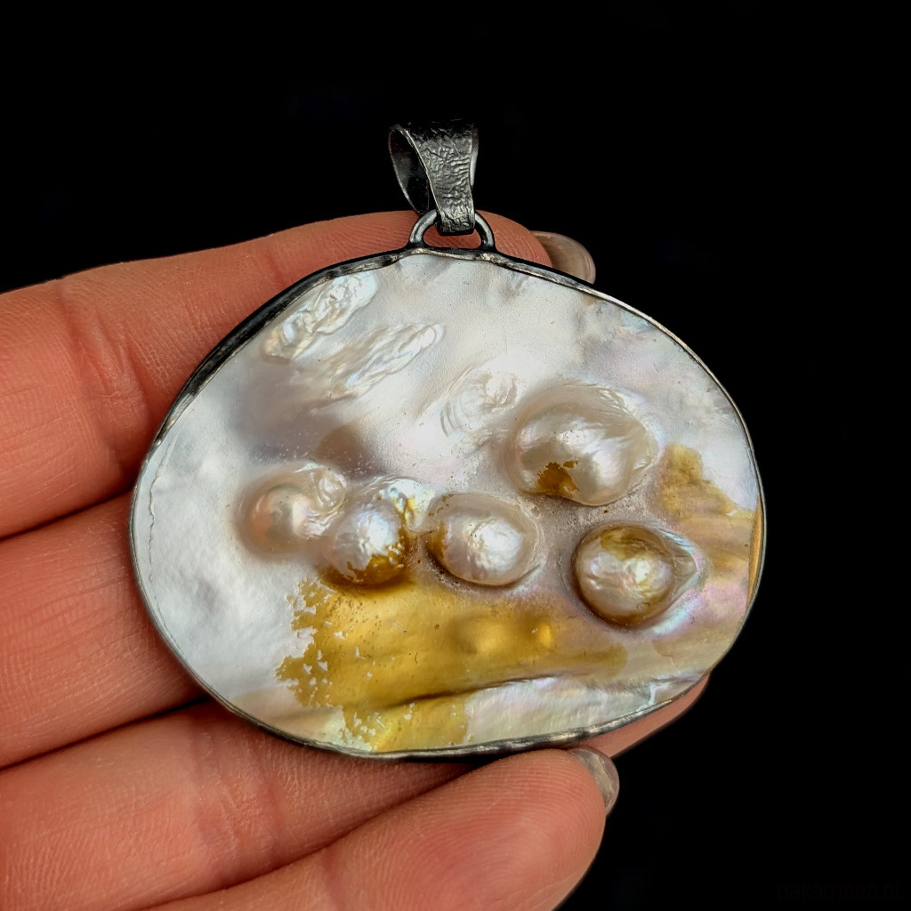 Wisior wykonany z oksydowanego srebra próby 925 z oprawioną muszlą, którą narastają perły. Przepiękne zjawisko. Ponadczasowa elegancja, klasyka z nutą awangardy. Wymiary 53 x 40 mm, długość max 55 mm. Waga 14 g. Polecam, piękna, ponadczasowa biżuteria.