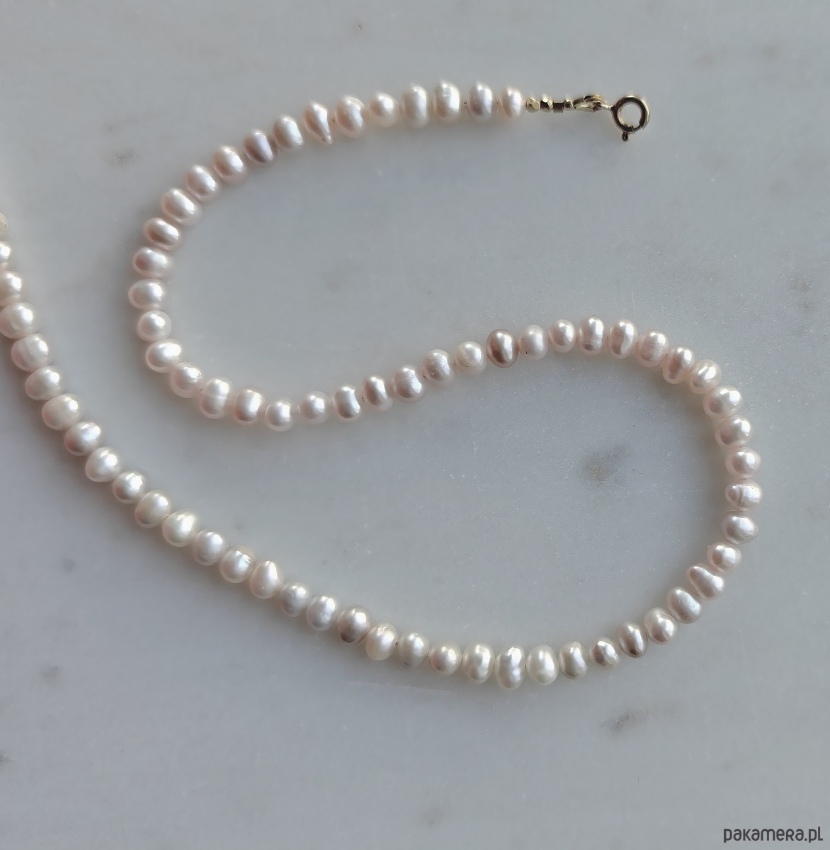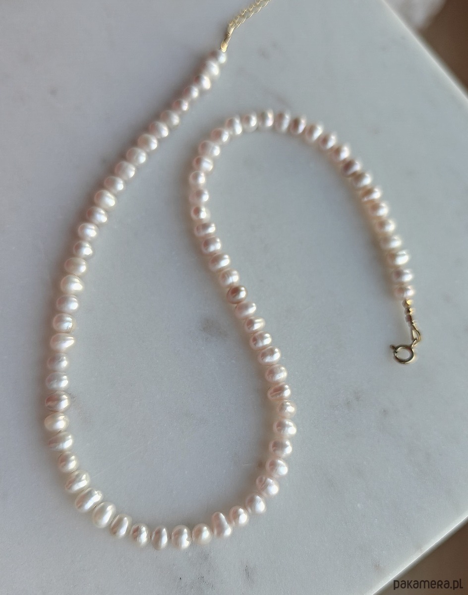 Sznur drobnych pereł słodkowodnych wykończony pozłacanym srebrem. Perełki mają kolor złamanej bieli, z delikatnym różowym overtonem. Ich kształt jest lekko wydłużony, ładnie układają się na szyi. Ślicznie błyszczą, mimo drobnego rozmiaru są ozdobą zwracającą uwagę. To ponadczasowy wzór, idealny do wielu stylizacji.
