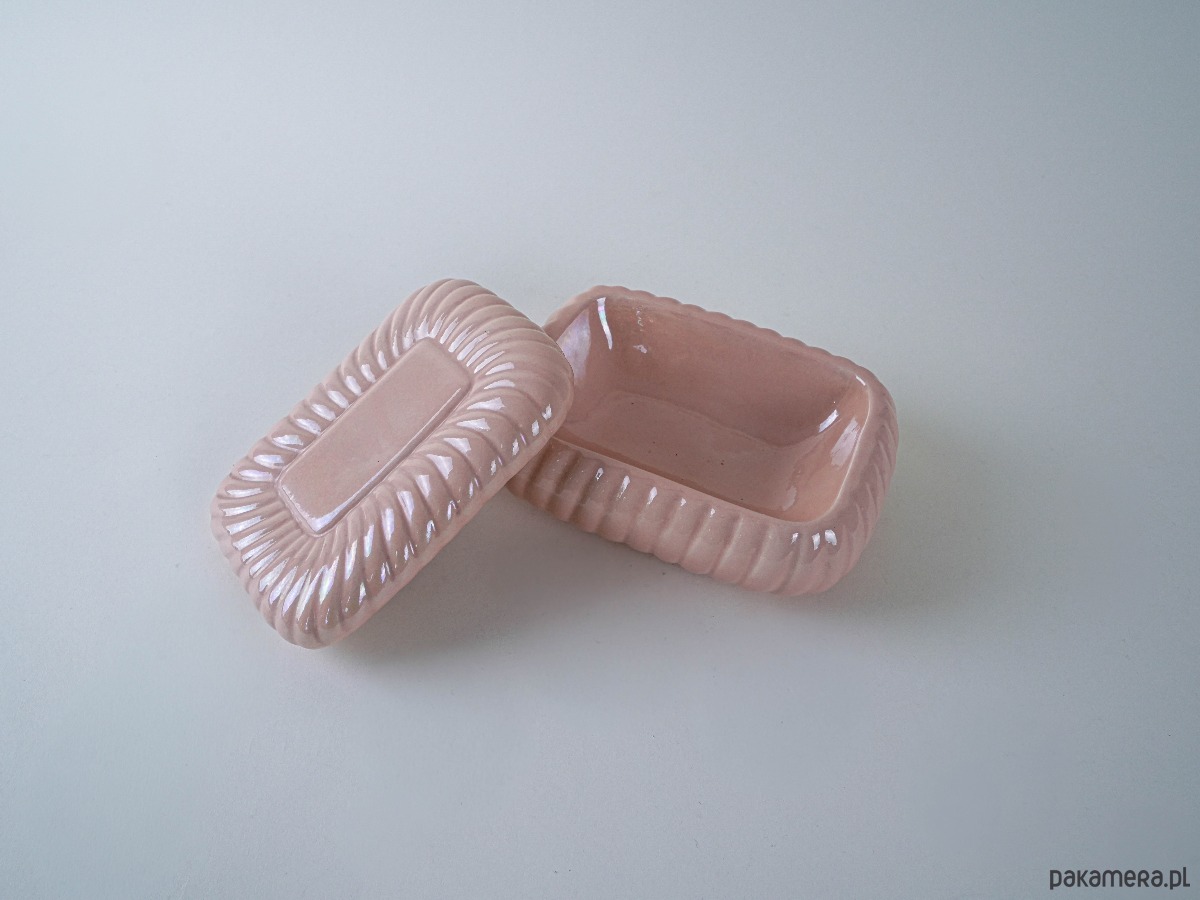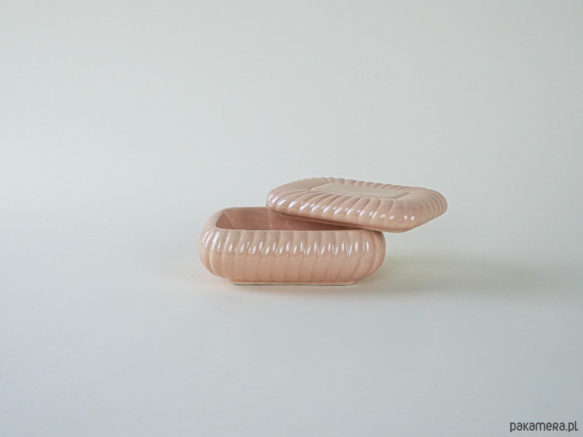 Lśniąca szkatułka o miękkiej, opływowej formie przypominającej poduszkę lub cukierka. Pokryta perłowym szkliwem w odcieniu łososiowym, odbija światło z subtelnym blaskiem. Idealna do przechowywania biżuterii, drobiazgów lub jako rzeźbiarski akcent na komodzie czy półce.
