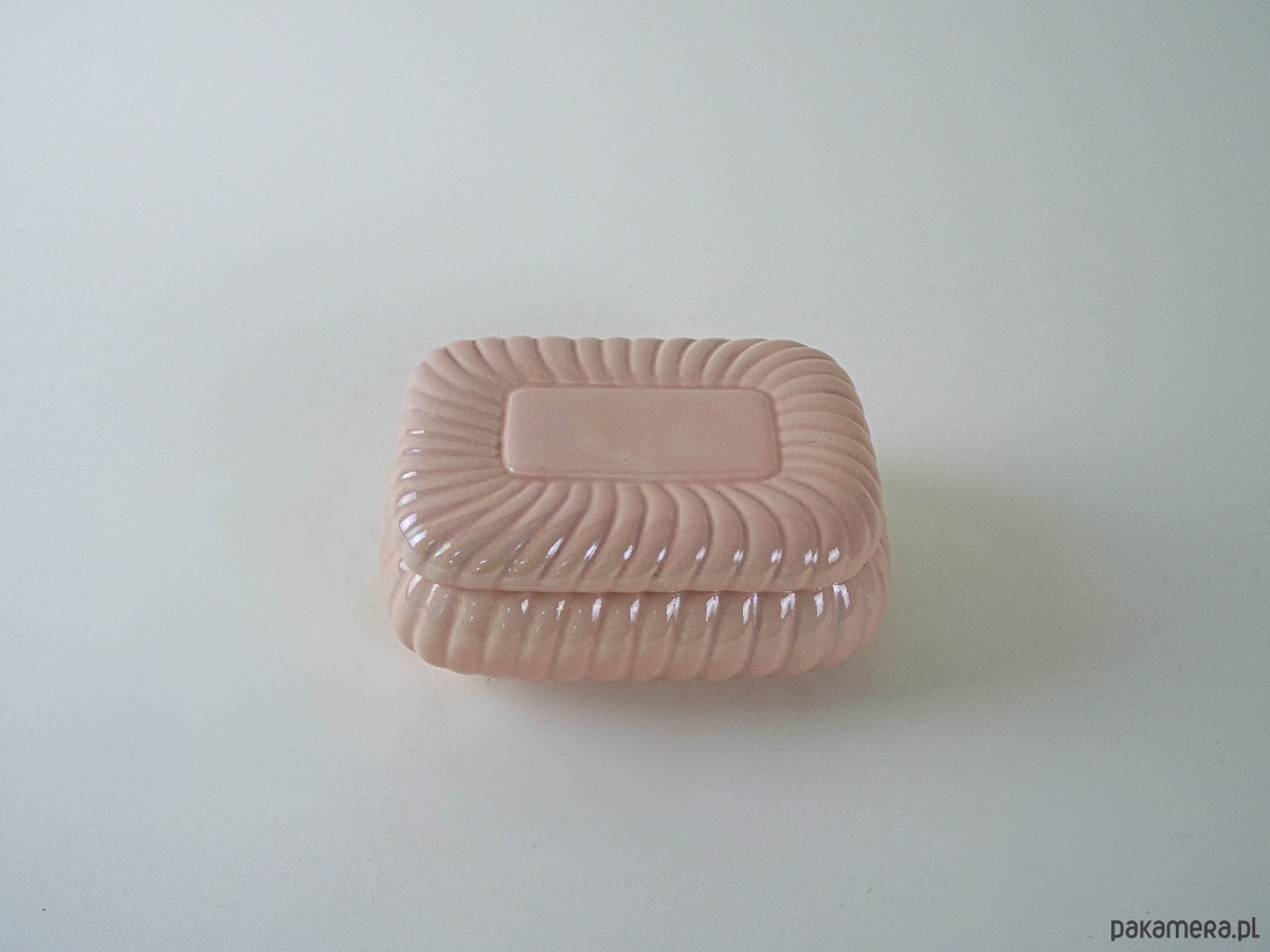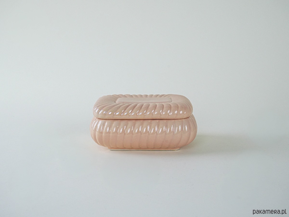 Lśniąca szkatułka o miękkiej, opływowej formie przypominającej poduszkę lub cukierka. Pokryta perłowym szkliwem w odcieniu łososiowym, odbija światło z subtelnym blaskiem. Idealna do przechowywania biżuterii, drobiazgów lub jako rzeźbiarski akcent na komodzie czy półce.