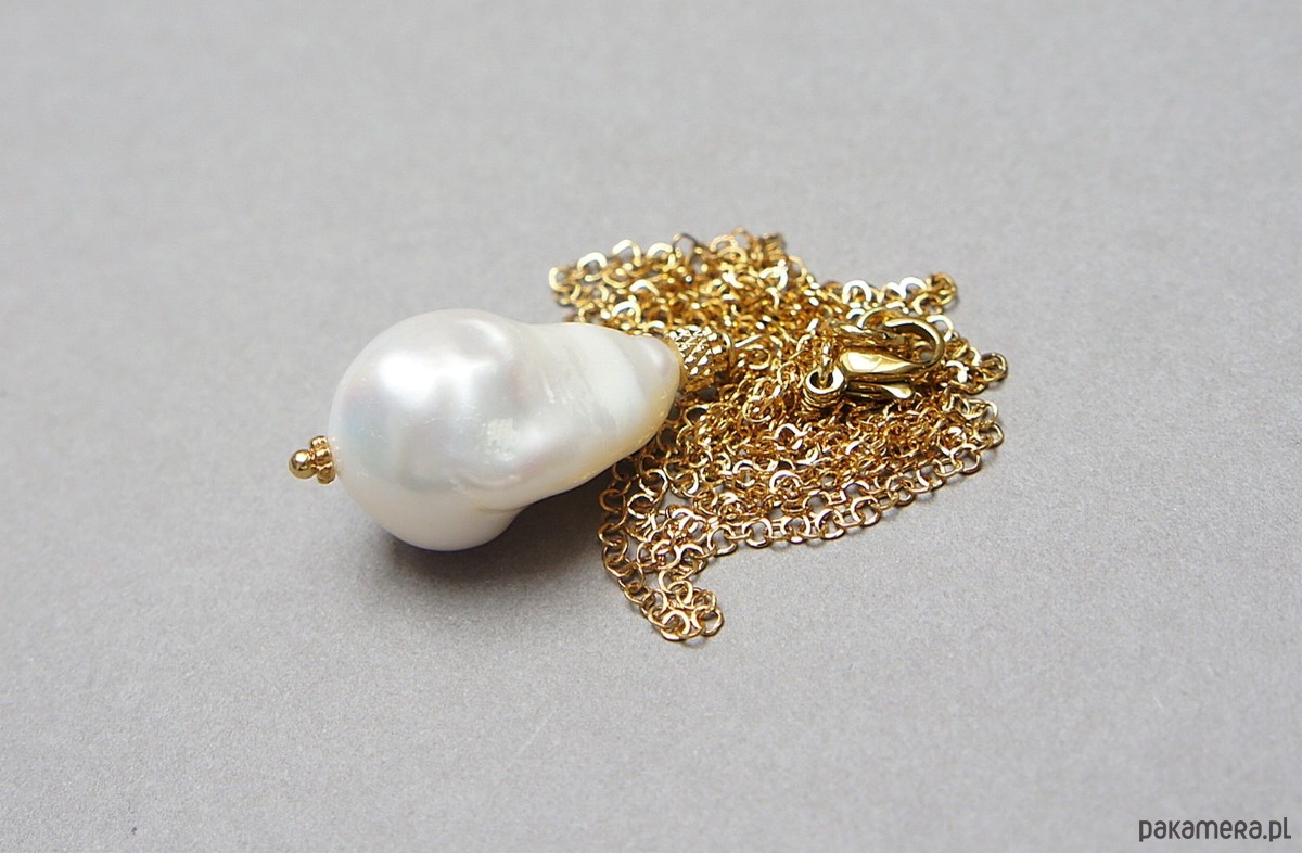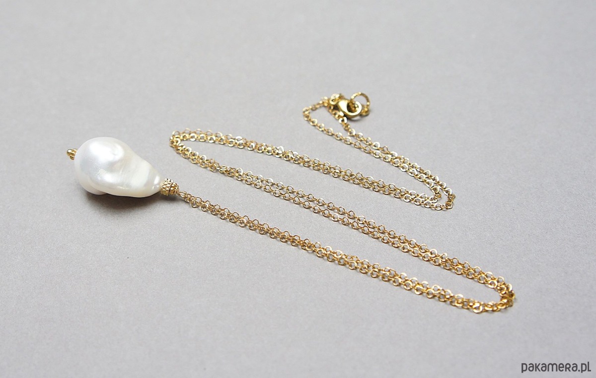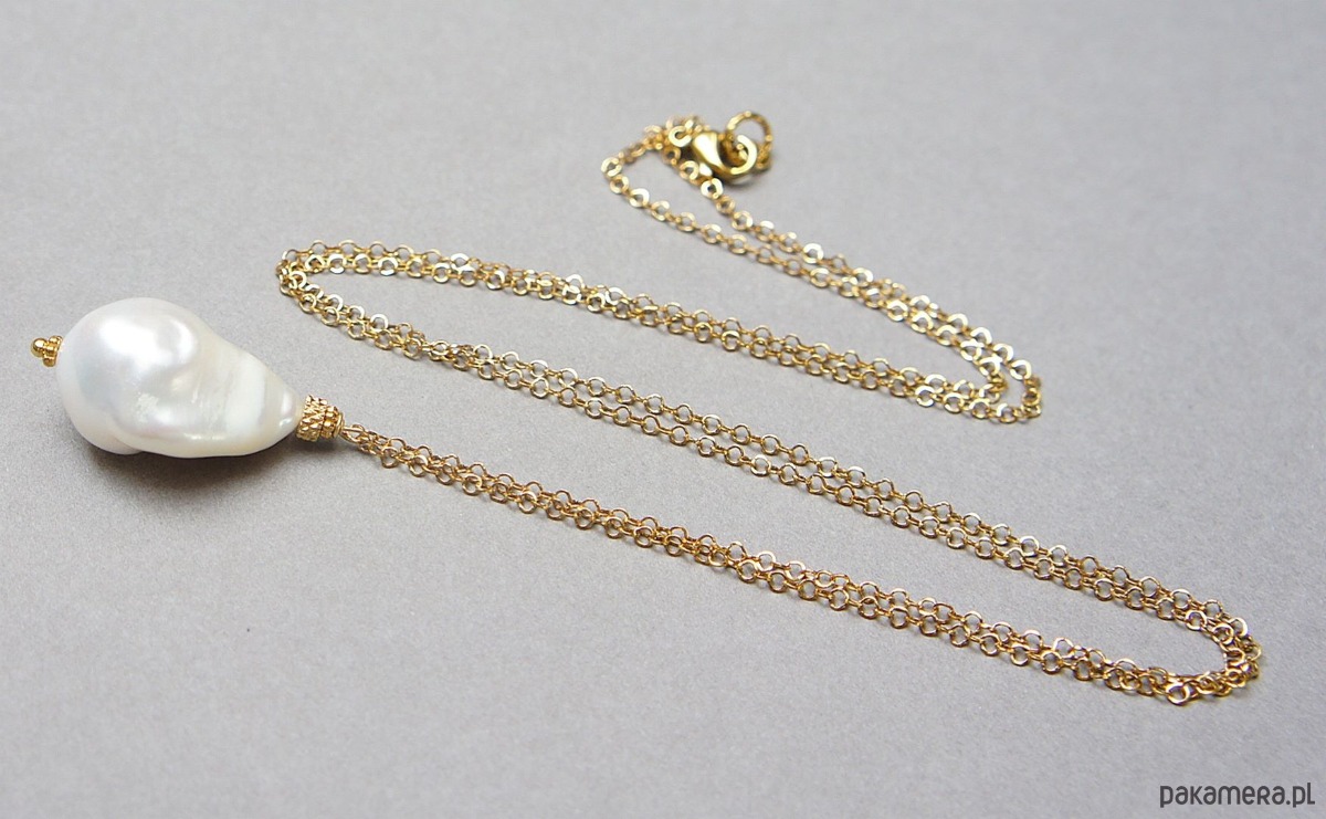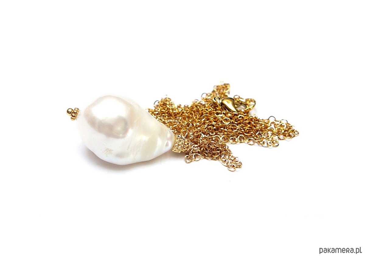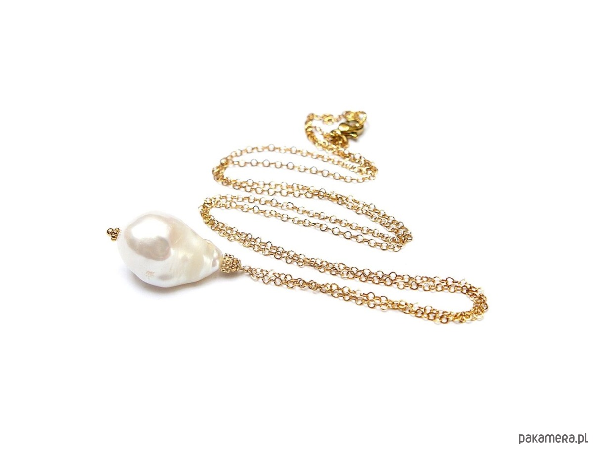 Długi naszyjnik wykonany z naturalnej dużej perły barokowej [ok. 23mm] oraz z pozłacanej stali szlachetnej. Długość łańcuszka: 70cm, długość części wiszącej ok. 3,2cm.