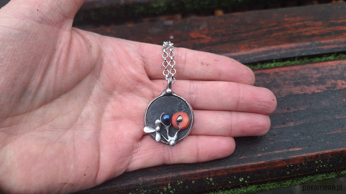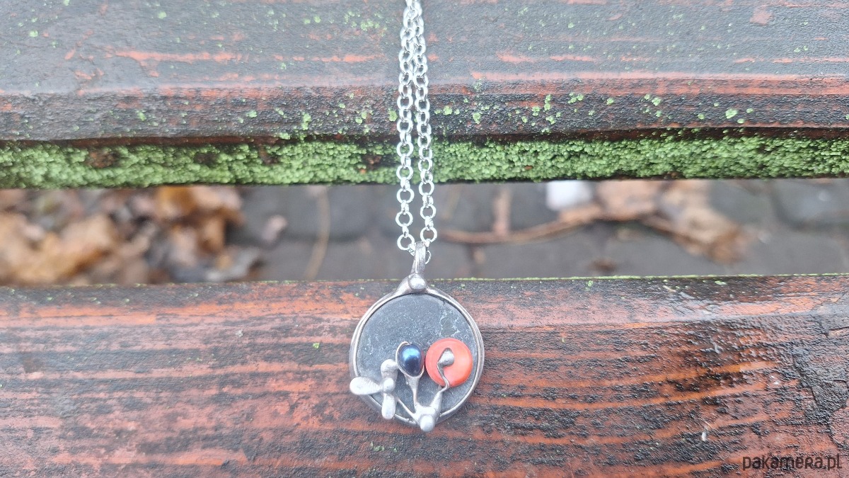 Wisiorek wykonany z miedzi, cyny, perły, koralowca i agatu. Wymiary ok. 2.5 na 2.5 cm. Zawieszony na łańcuszku o długości ok. 50 cm.