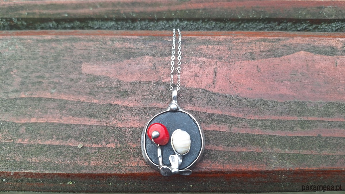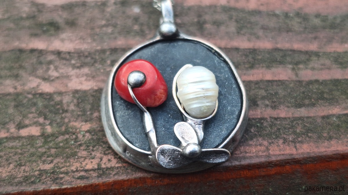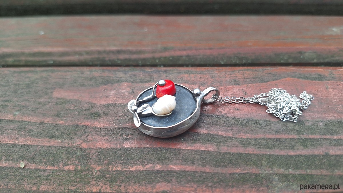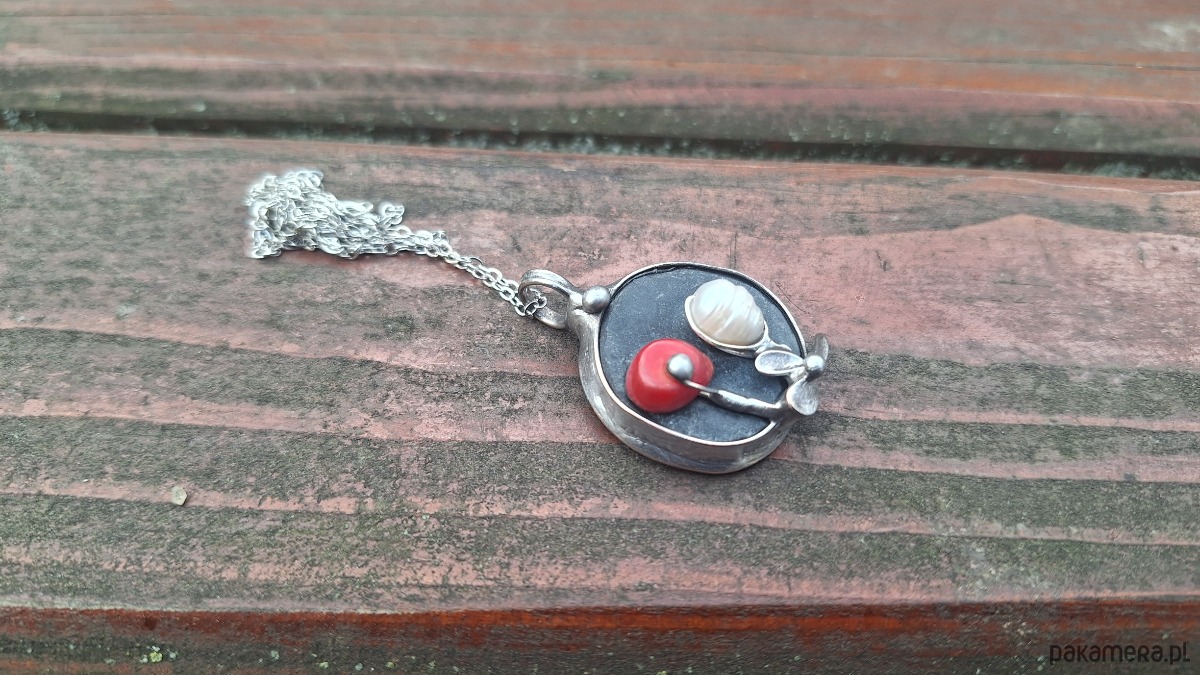 Wisiorek wykonany z miedzi, cyny, perły, koralowca i agatu. Wymiary ok. 2.5 na 2.5 cm. Zawieszony na łańcuszku o długości ok. 50 cm.