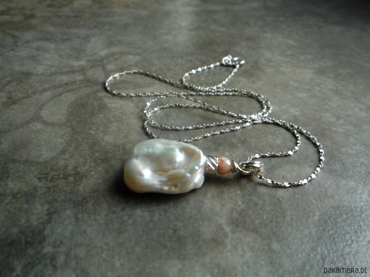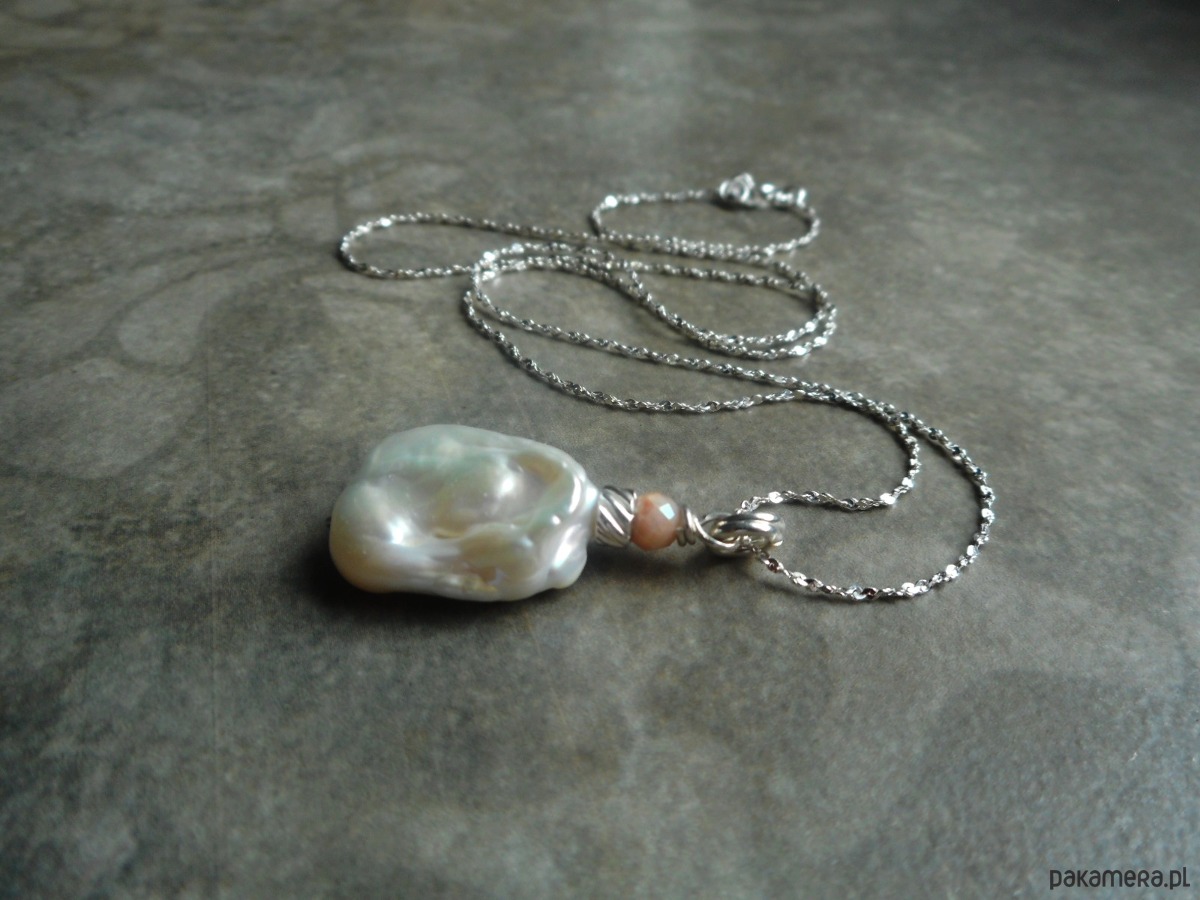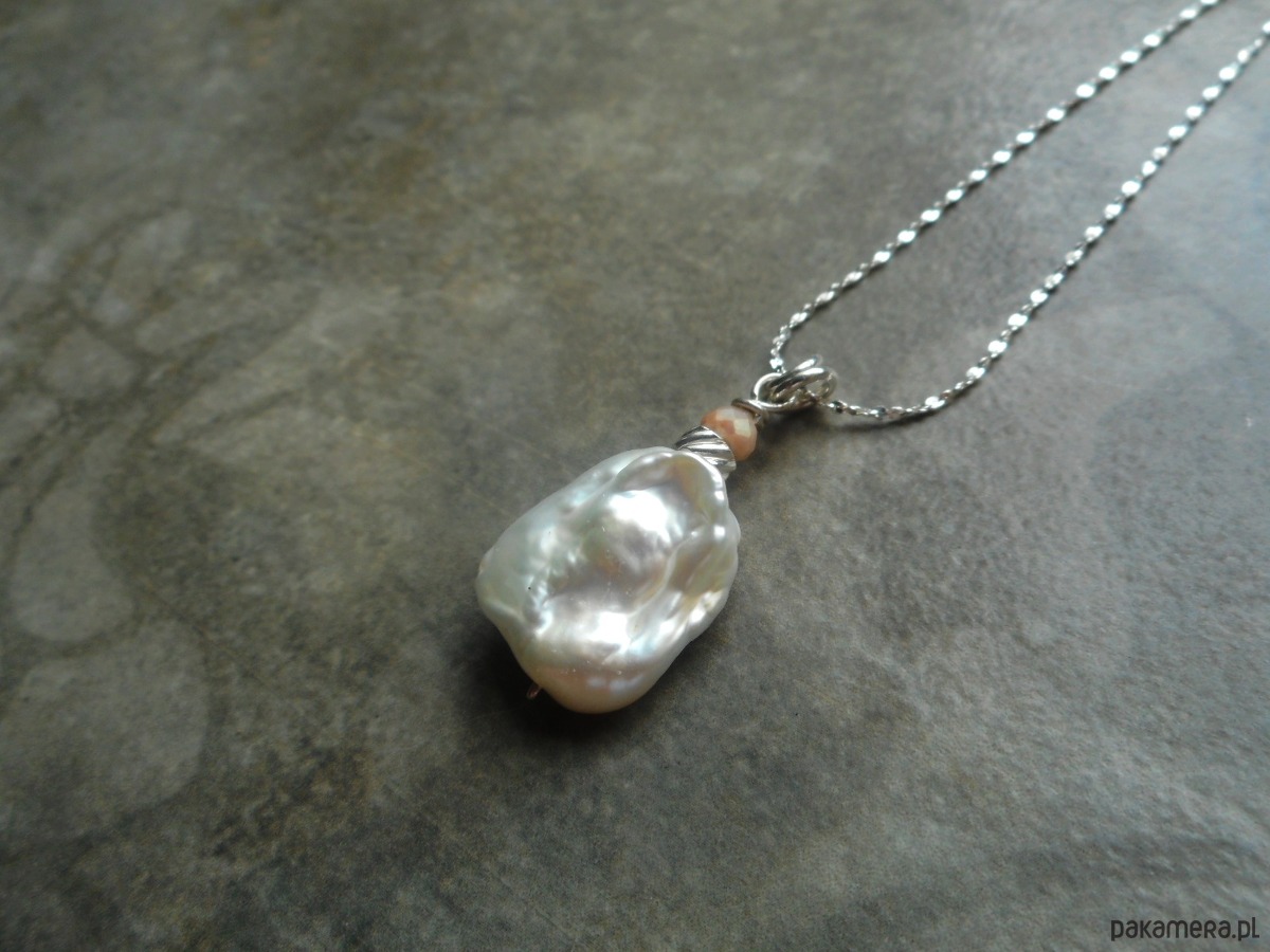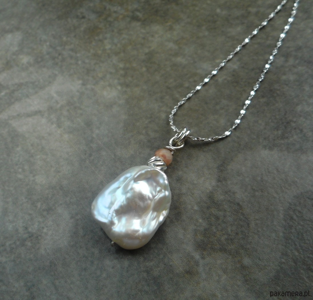 Piękny naszyjnik z kamieni naturalnych i szlachetnego srebra; klasyczny, elegancki wisiorek w postaci nieregularnej dużej perły hodowlanej zawieszonej na delikatnym, ozdobnym łańcuszku.