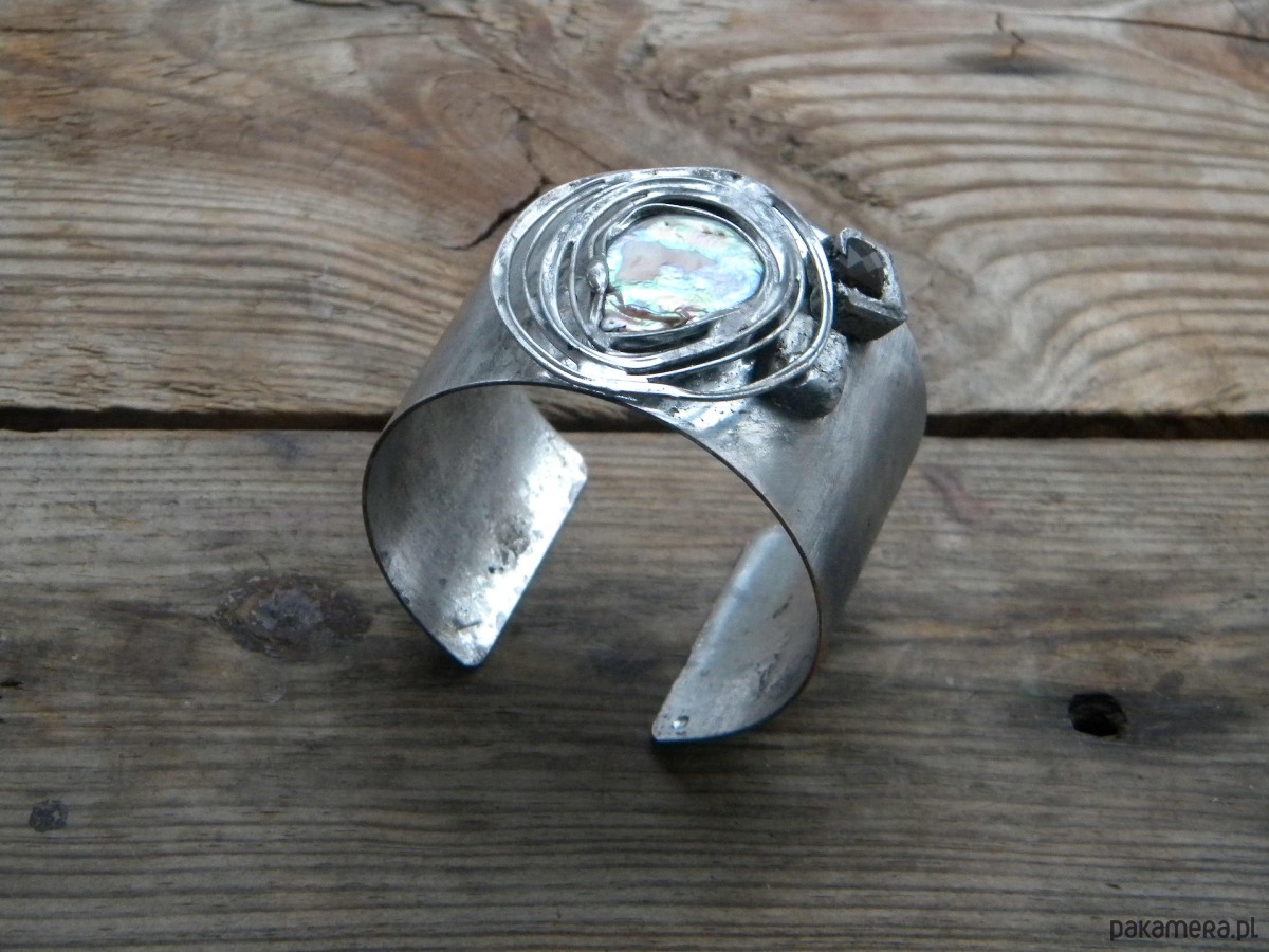 Bransoleta z ocynowanej miedzi, perł i kwarcu dymnego