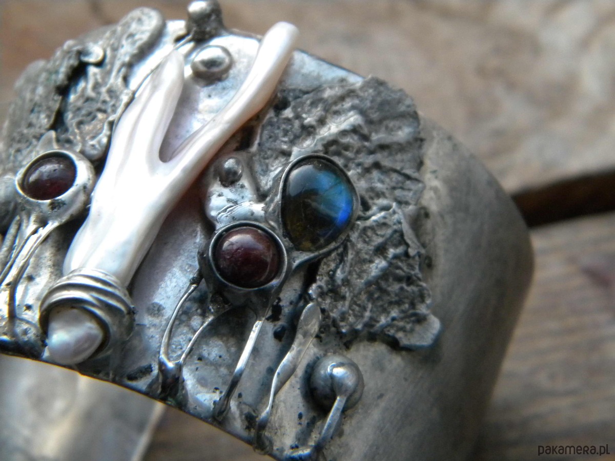 Bransoleta z ocynowanej miedzi, perły, granatów i labradorytu