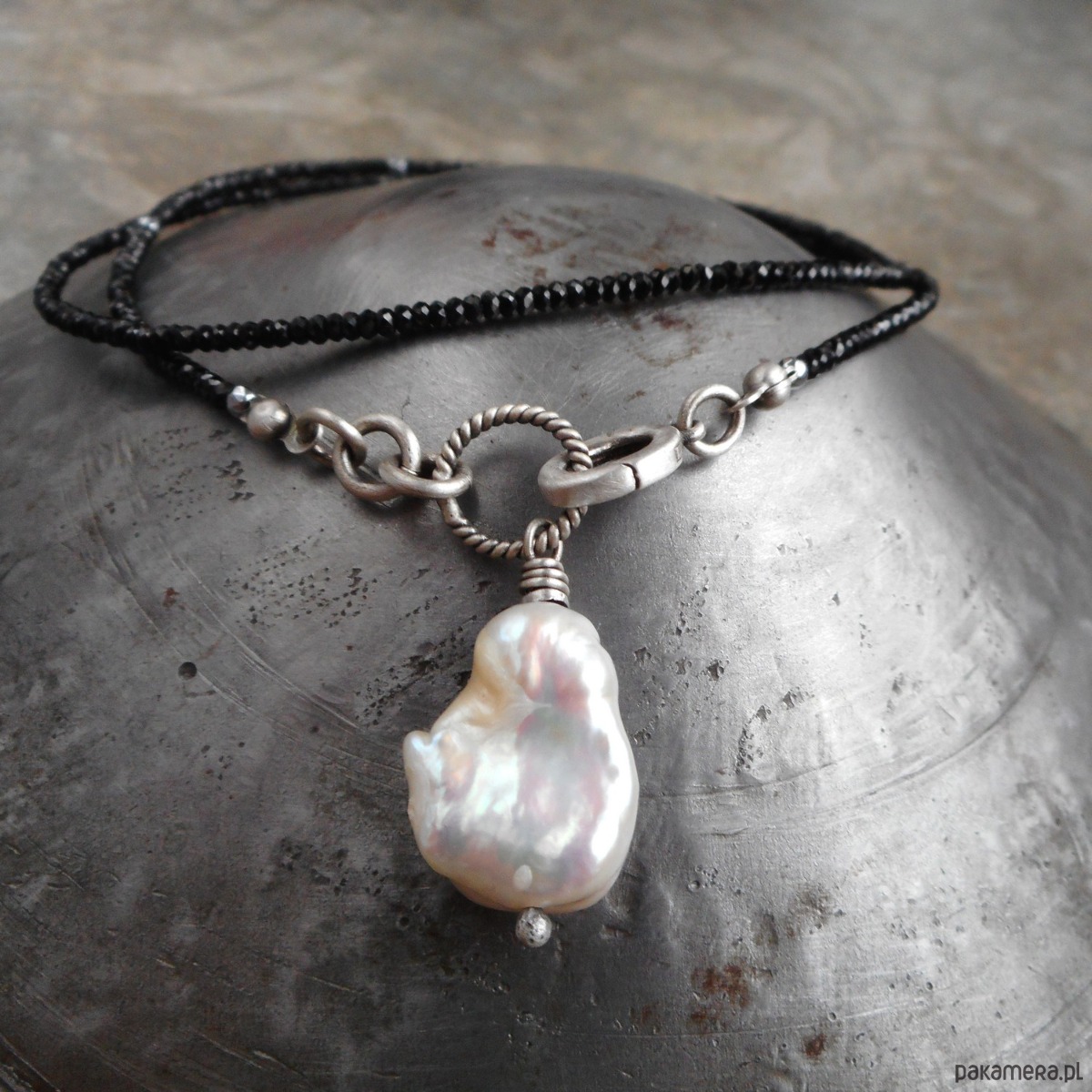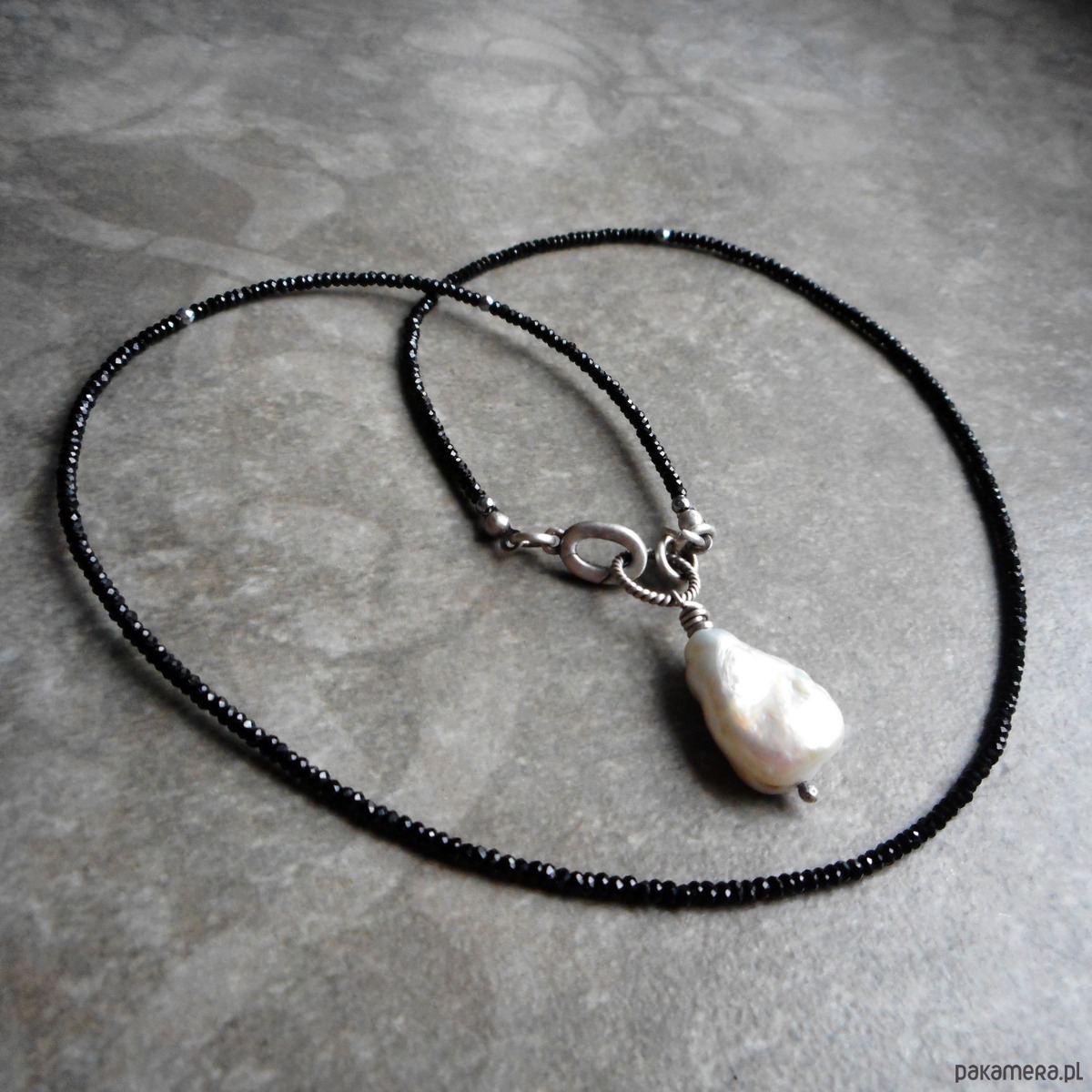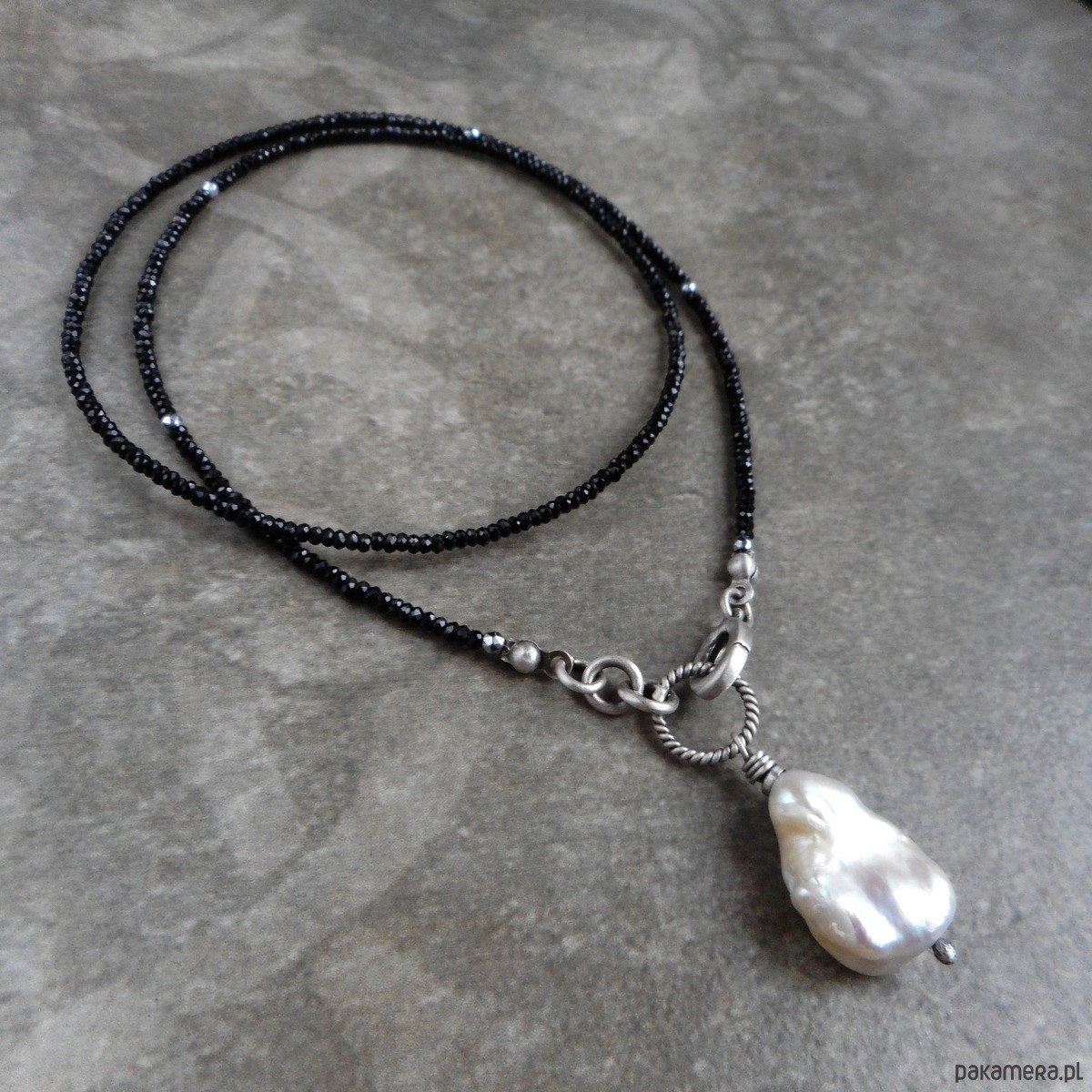 Piękny naszyjnik wykonany ze szlachetnego srebra i kamieni naturalnych; elegancki i bardzo kobiecy, połączenie kolorystycznie kontrastowe mocno lśniących czarnych spineli i dużej, nieregularnej perły hodowlanej nadaje naszyjnikowi niepowtarzalnego charakteru.