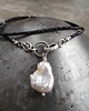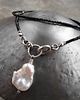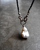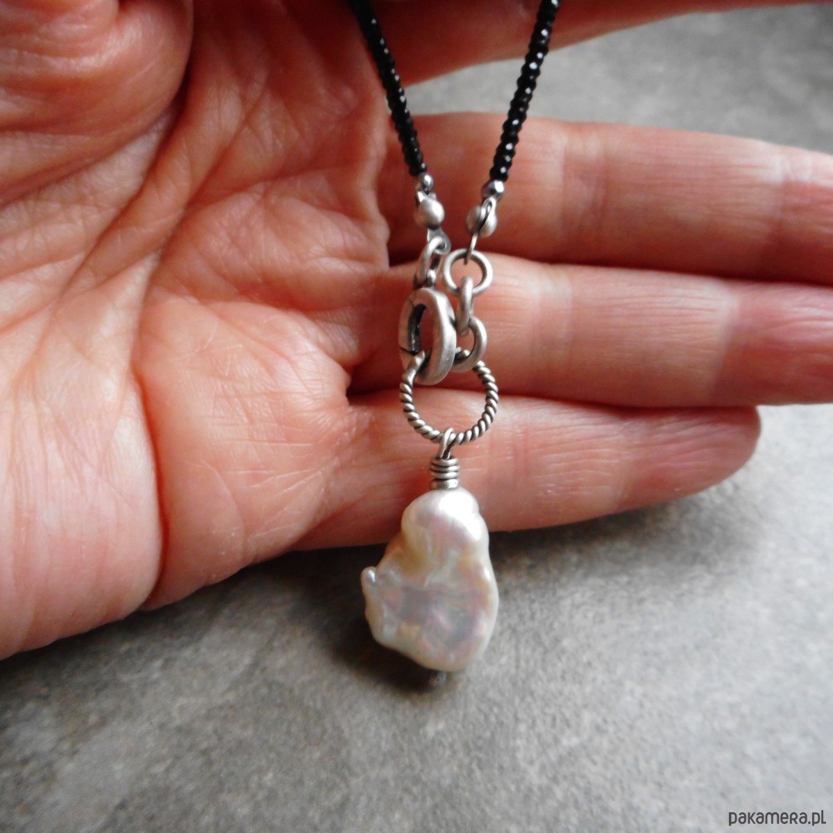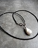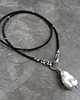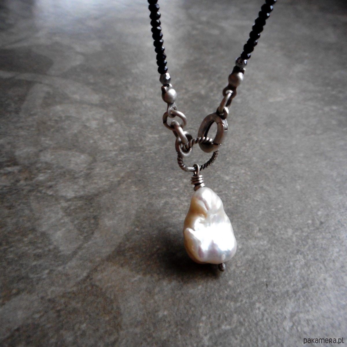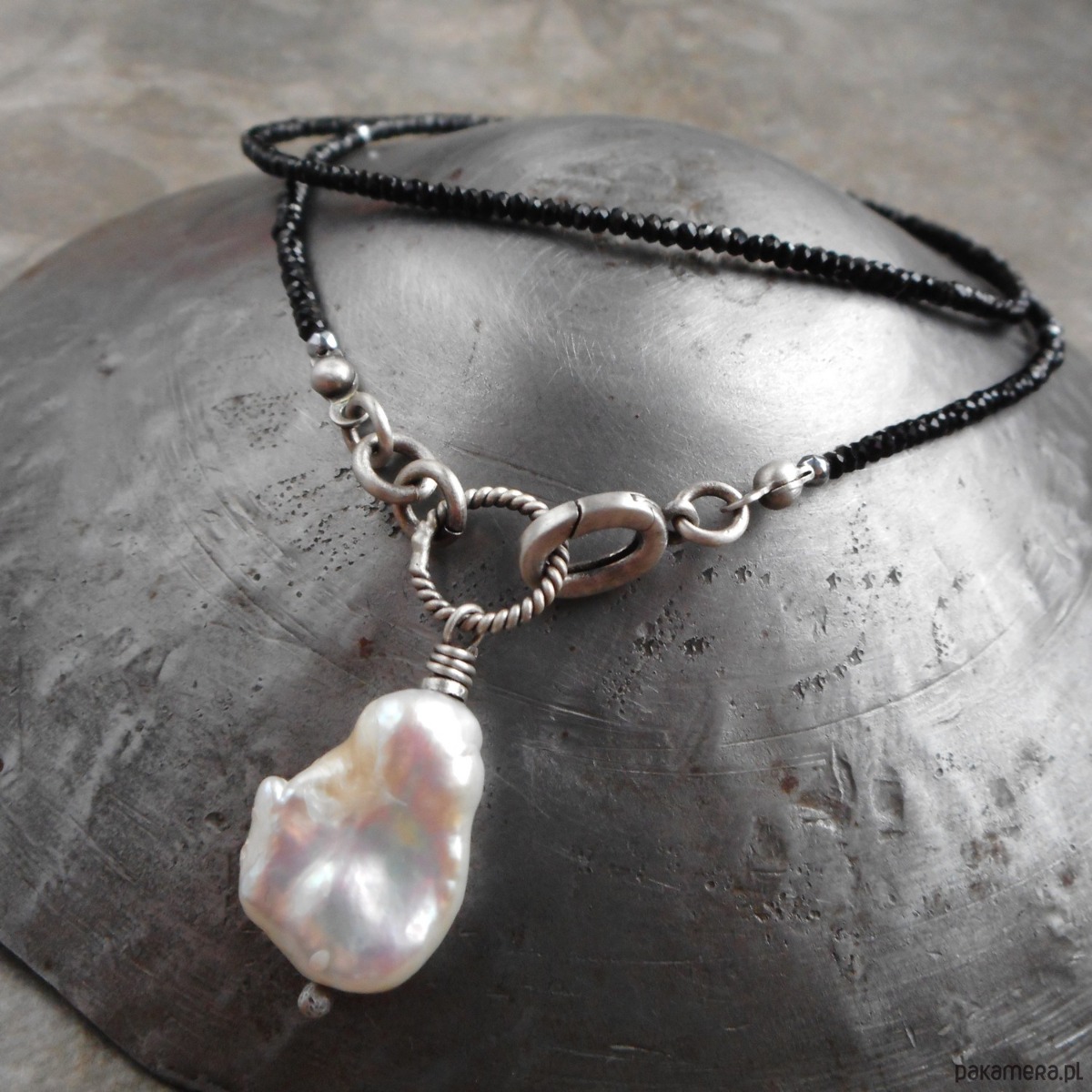 Piękny naszyjnik wykonany ze szlachetnego srebra i kamieni naturalnych; elegancki i bardzo kobiecy, połączenie kolorystycznie kontrastowe mocno lśniących czarnych spineli i dużej, nieregularnej perły hodowlanej nadaje naszyjnikowi niepowtarzalnego charakteru.