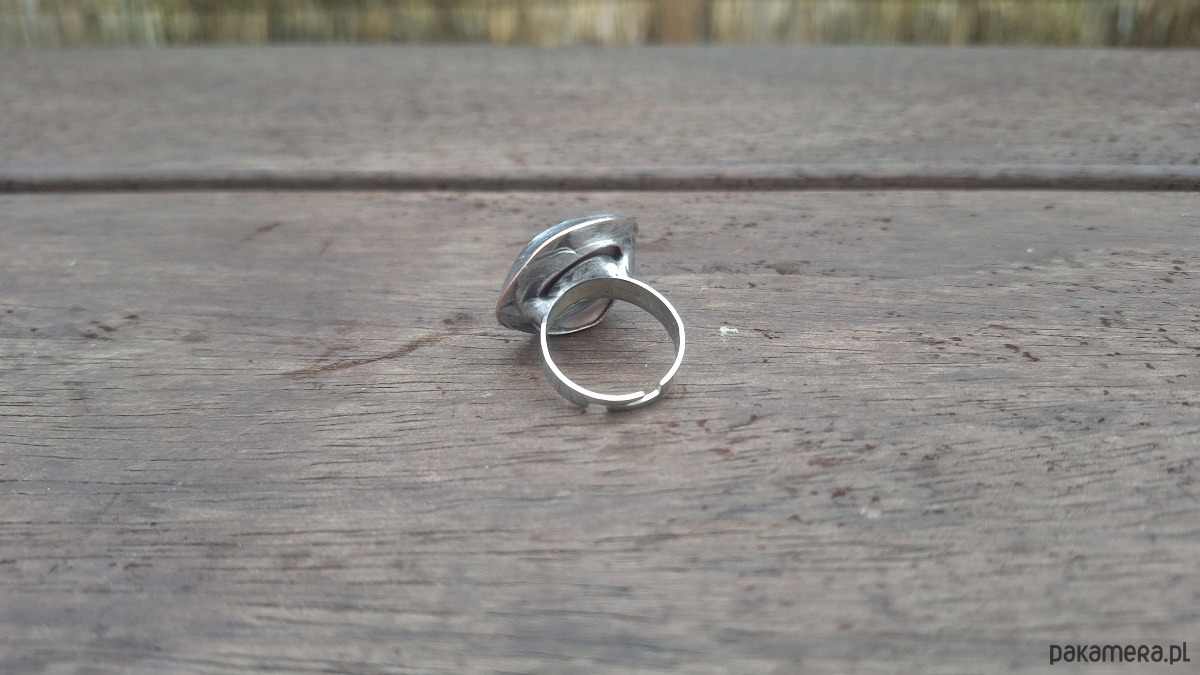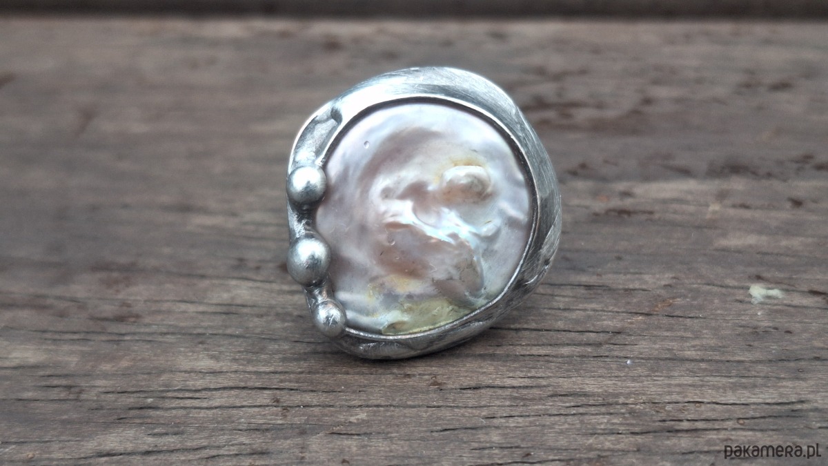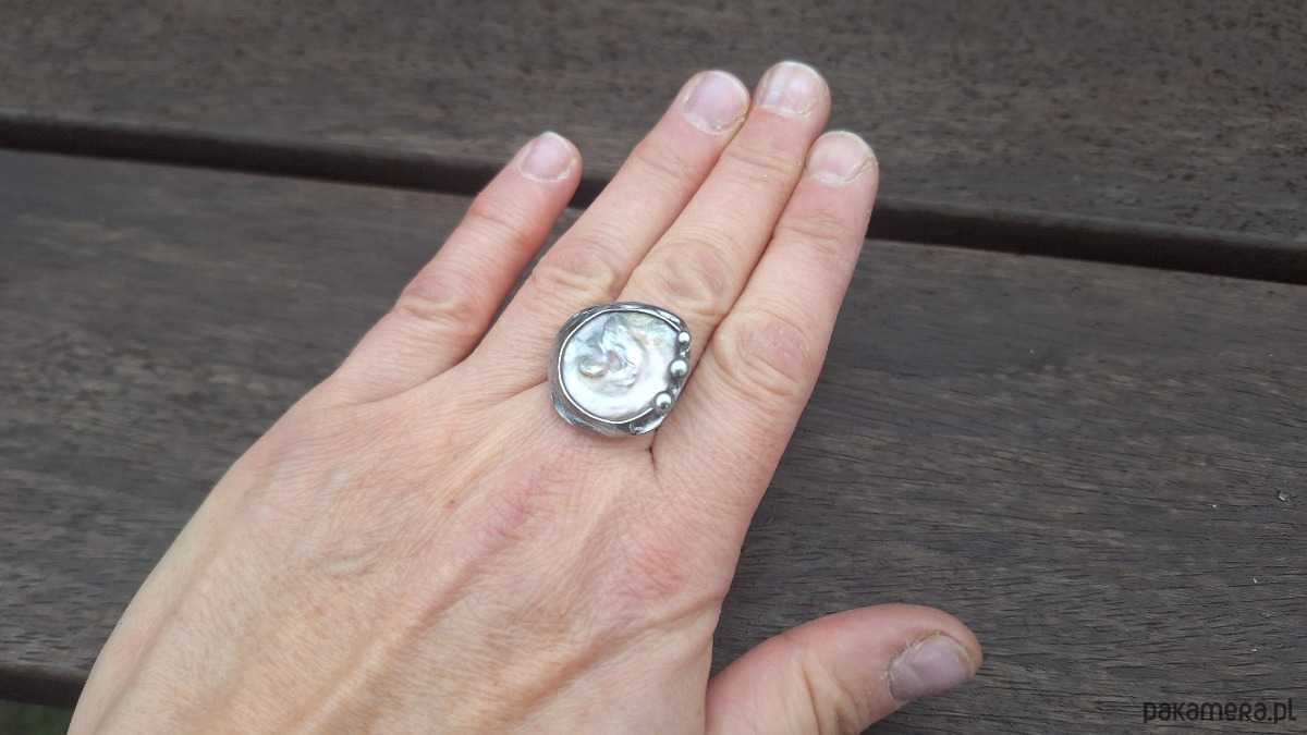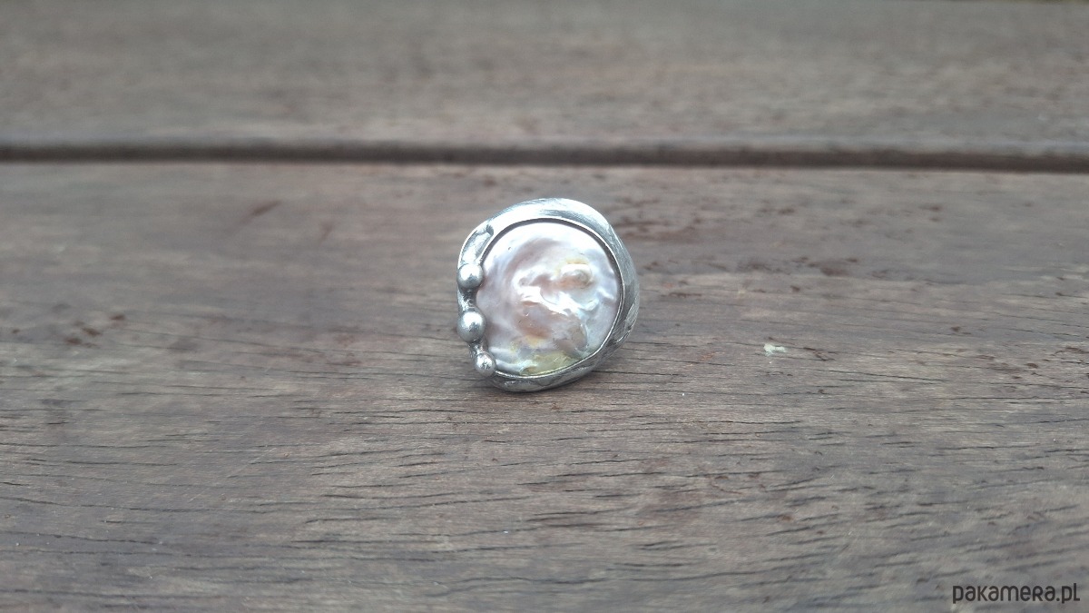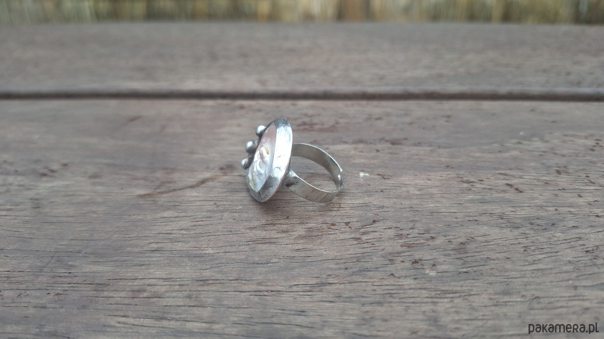 Pierścionek wykonany z miedzi, cyny i perły. Wymiary ok. 2.3 na 2.3 cm. Regulowany. Nie jest ciężki.