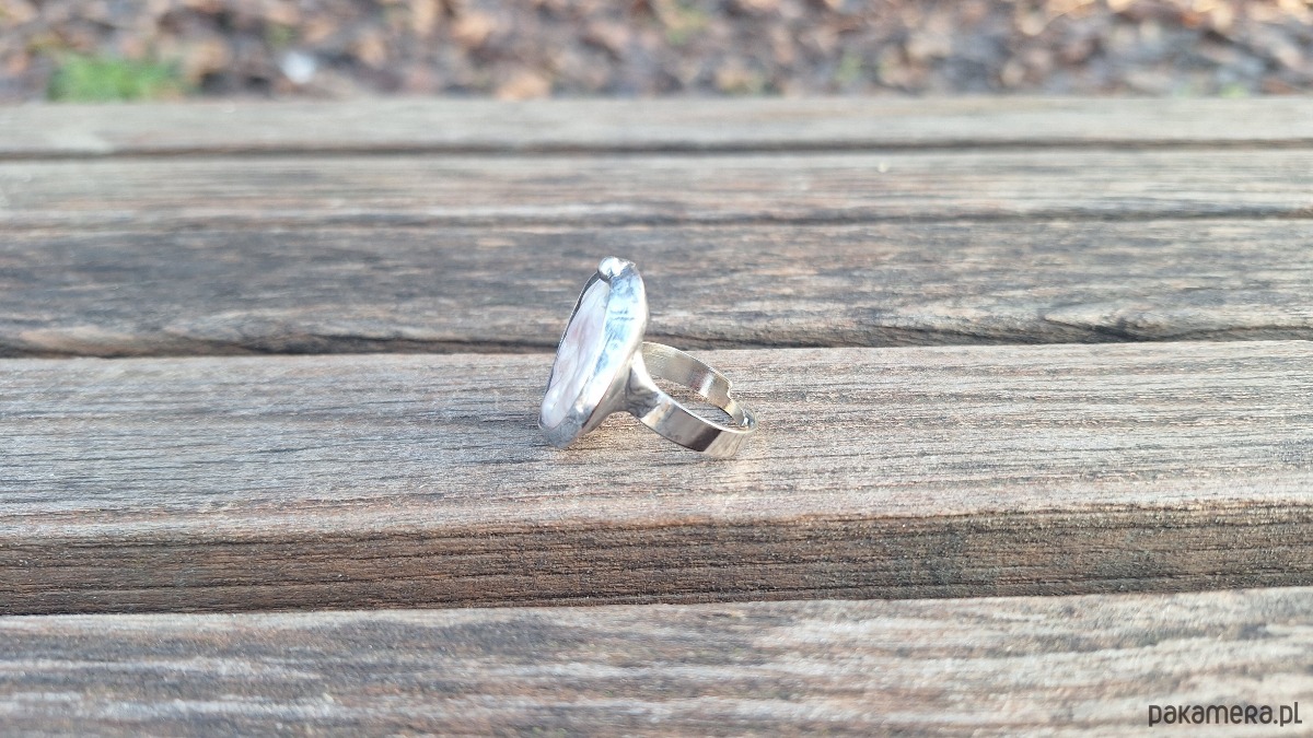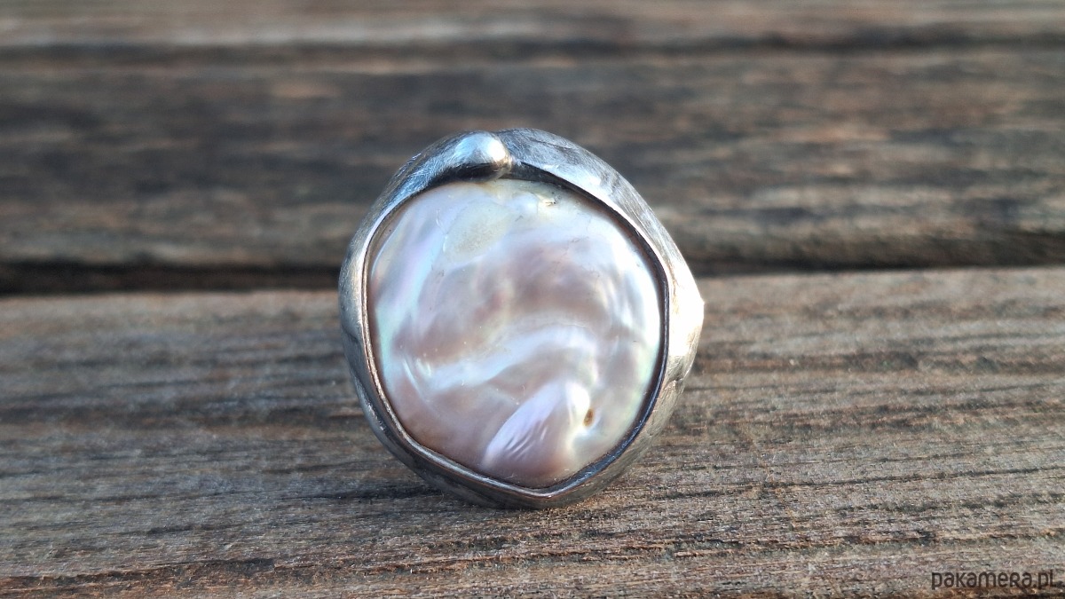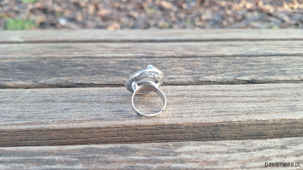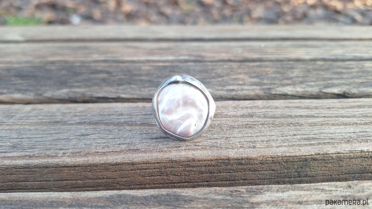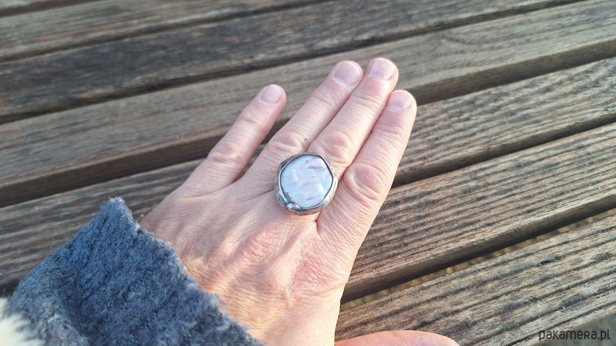 Pierścionek wykonany z miedzi, cyny i perły. Wymiary ok. 2.2 na 2.2 cm. Regulowany. Nie jest ciężki.