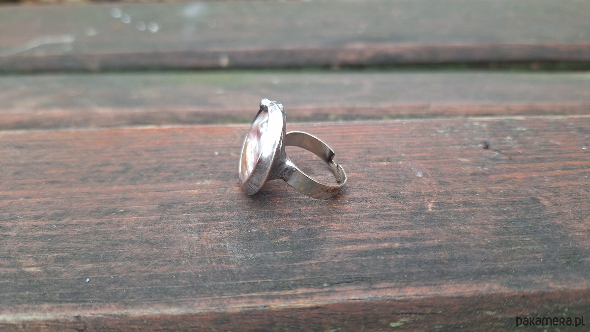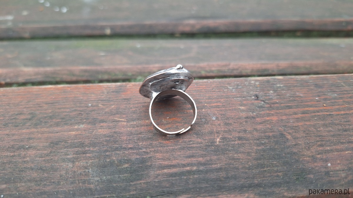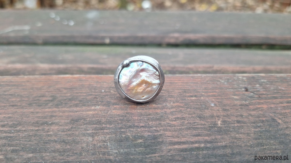 Pierścionek wykonany z miedzi, cyny i perły. Wymiary ok. 2.2 na 2.2 cm. Regulowany. Nie jest ciężki.