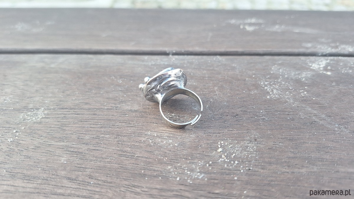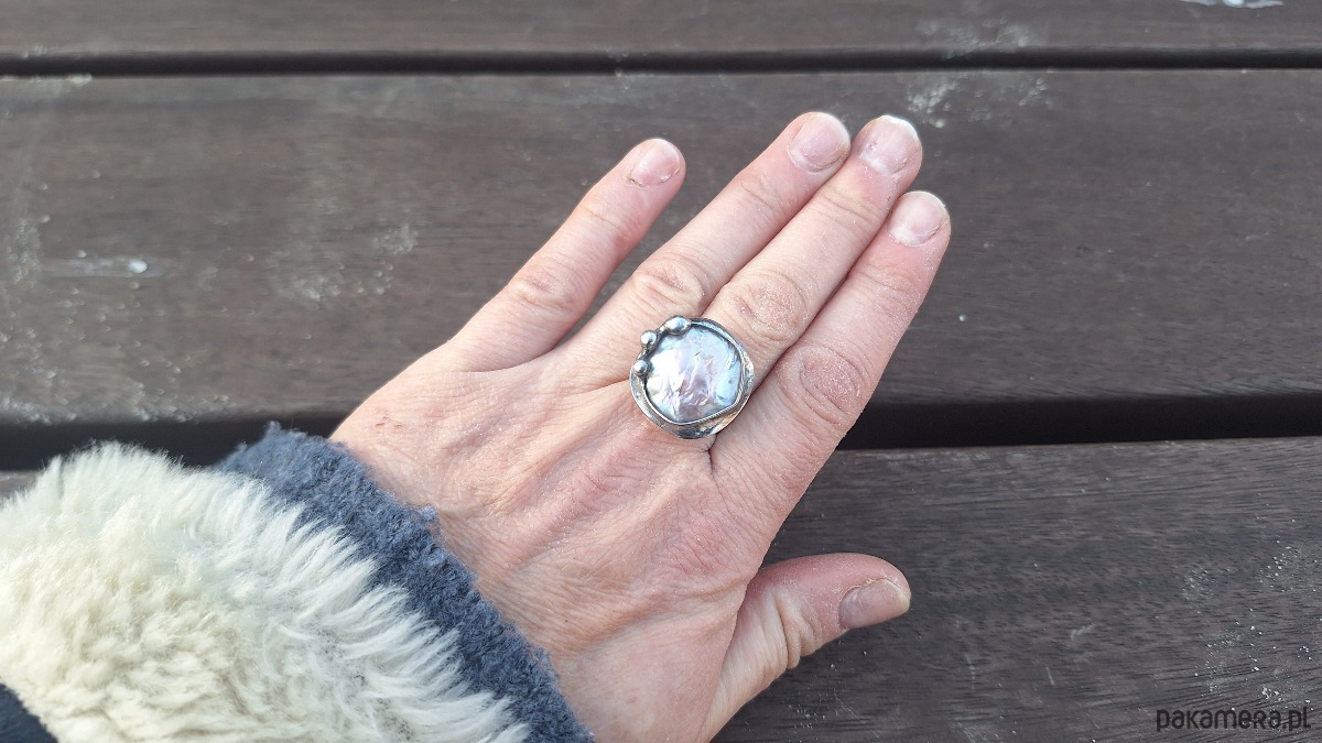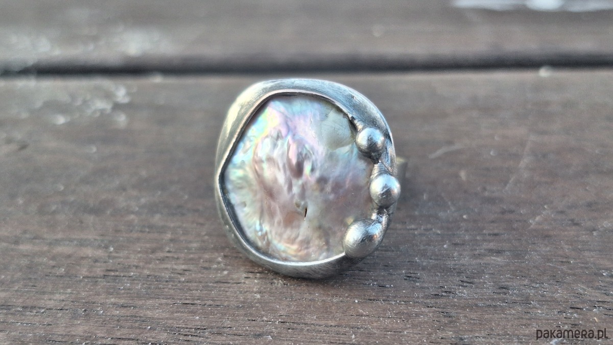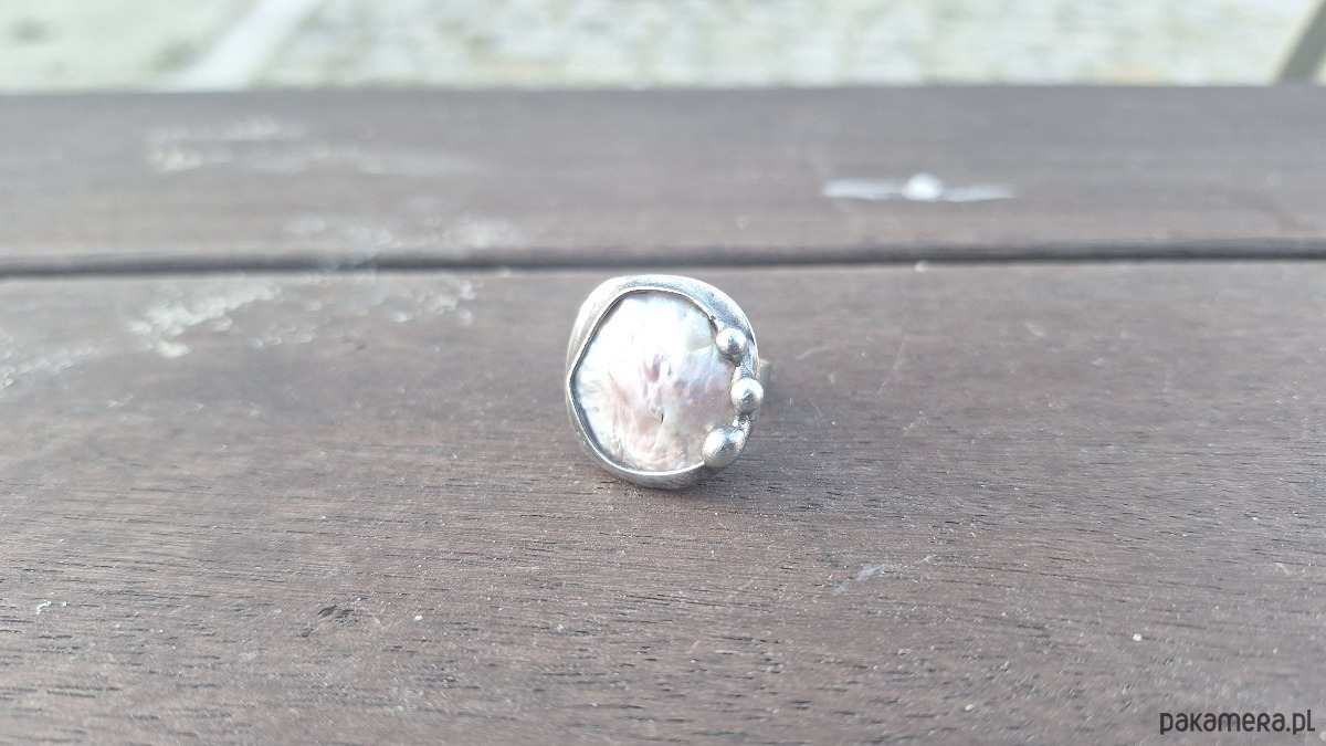 Pierścionek wykonany z miedzi, cyny i perły. Wymiary ok. 2 na 2 cm. Regulowany. Nie jest ciężki.