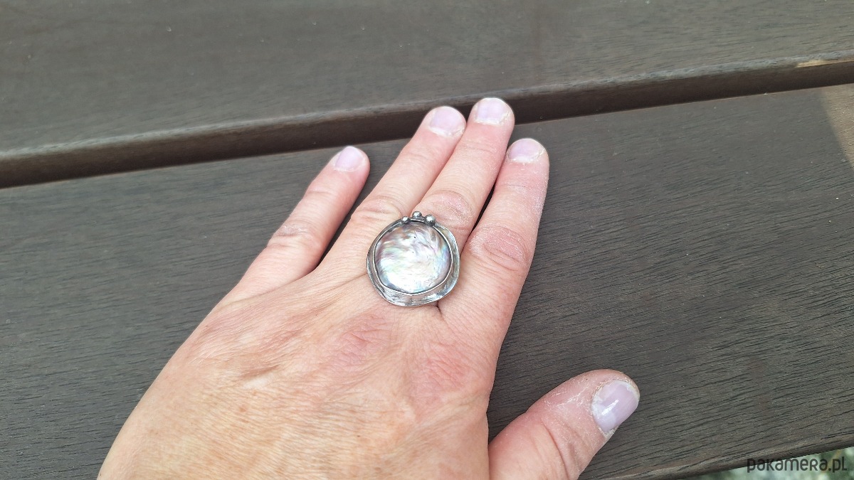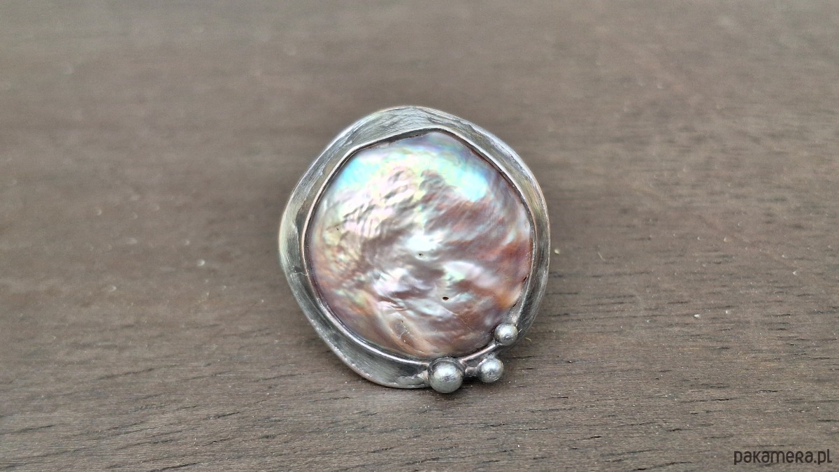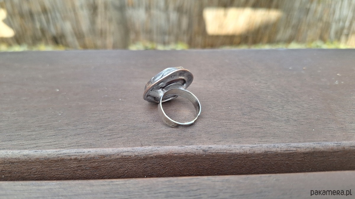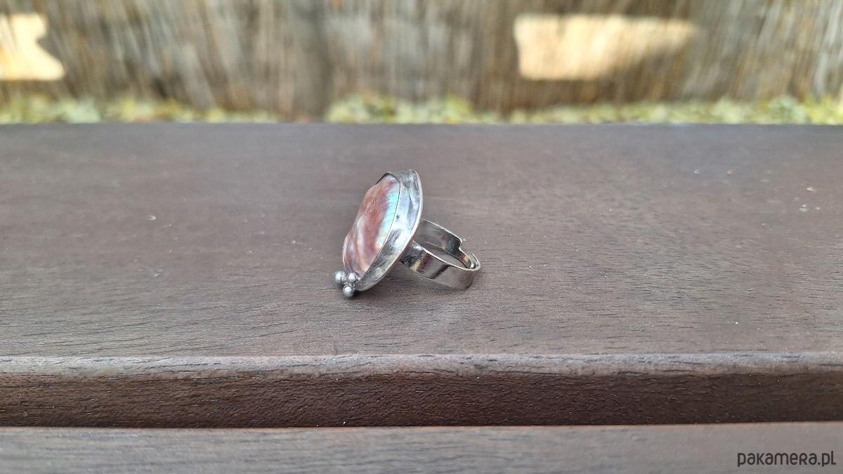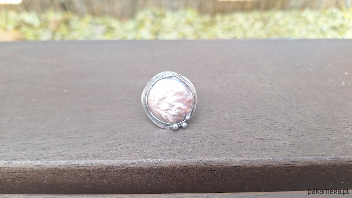 Pierścionek wykonany z miedzi, cyny i perły. Wymiary ok. 2.5 na 2.5 cm. Regulowany. Nie jest ciężki.