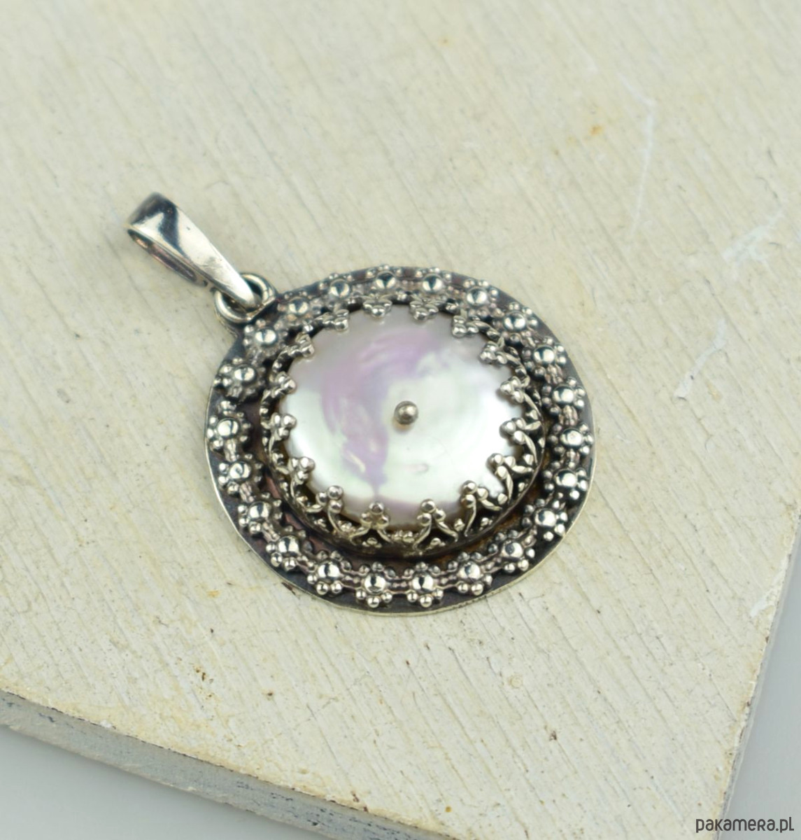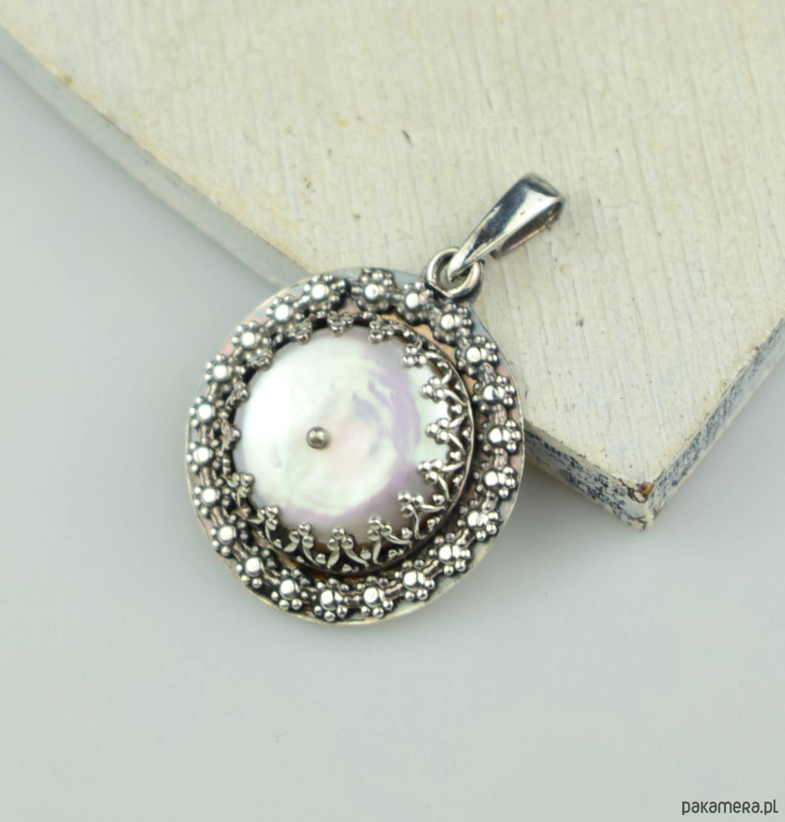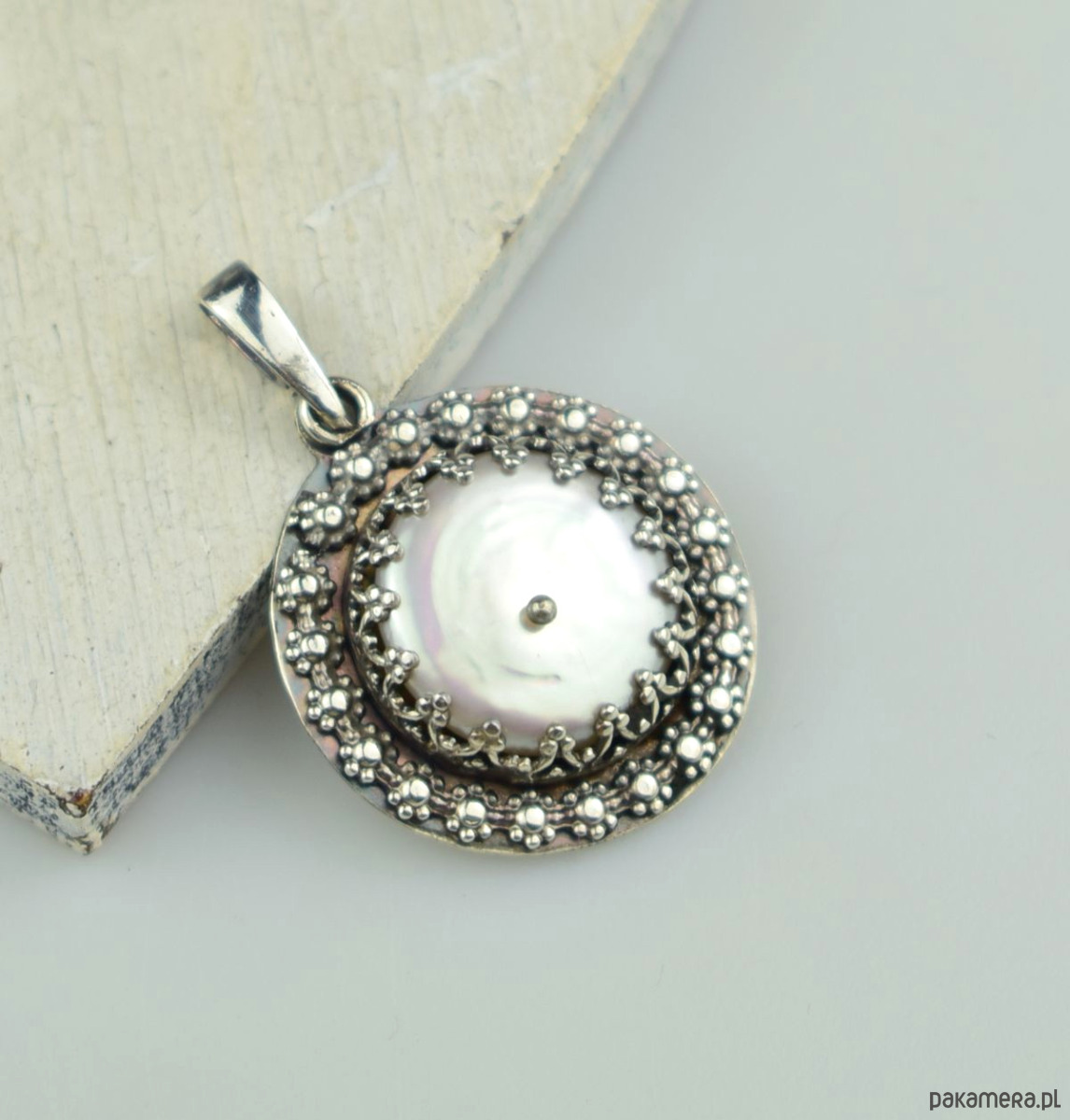 Wisiorek został wykonany w całości ze srebra (próba 925) z perłą. Biżuteria została przyciemniona (oksydowanie) i wypolerowana. Długość całkowita wisiora 3,5 cm. Biżuteria zostanie zapakowana w ozdobne pudełko.