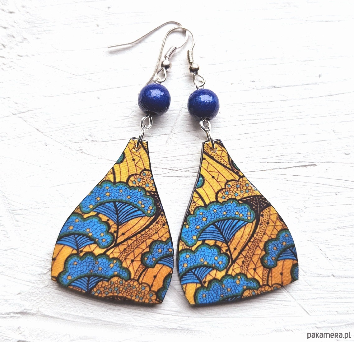 kolczyki drewniane, ozdobione metodą decoupage, dwustronne, starannie wykończone farbami akrylowymi i zabezpieczone wielokrotnie lakierem, koraliki drewniane, bigle posrebrzane, długość kolczyków bez bigli: 6 cm, szerokość: 3 cm, bardzo lekkie