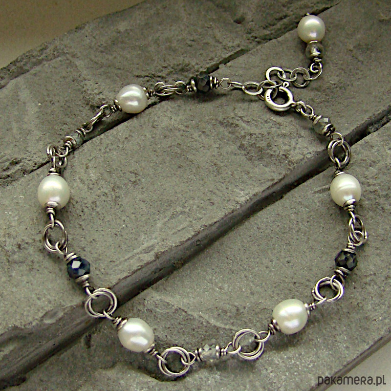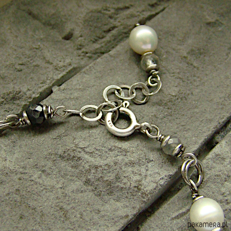 Kobieca, subtelna bransoletka do kompletu z kolczykami i naszyjnikiem z mojej galerii. Wykonana w całości ze srebra próby 925 oraz 7 mm białych pereł słodkowodnych, fasetowanych kulek szafiru wielkości 4 mm i fasetowanych oponek labradorytu. Całkowita długość bransoletki regulowana 18,5 - 20,5 cm. Ozdobnie zapakowana.