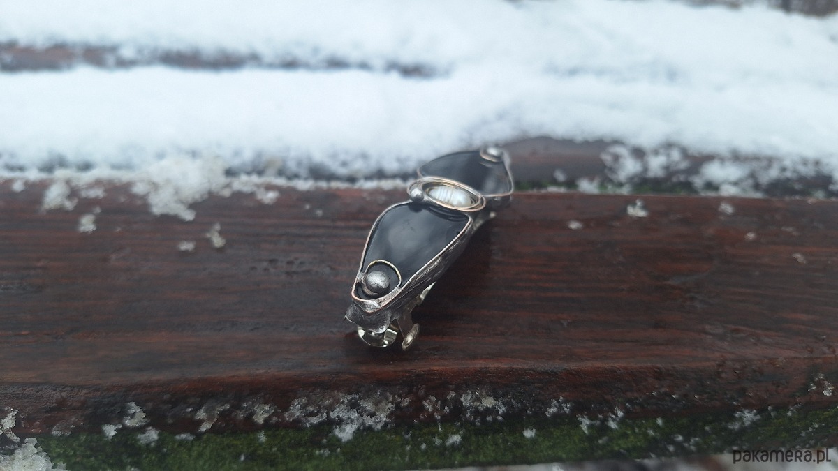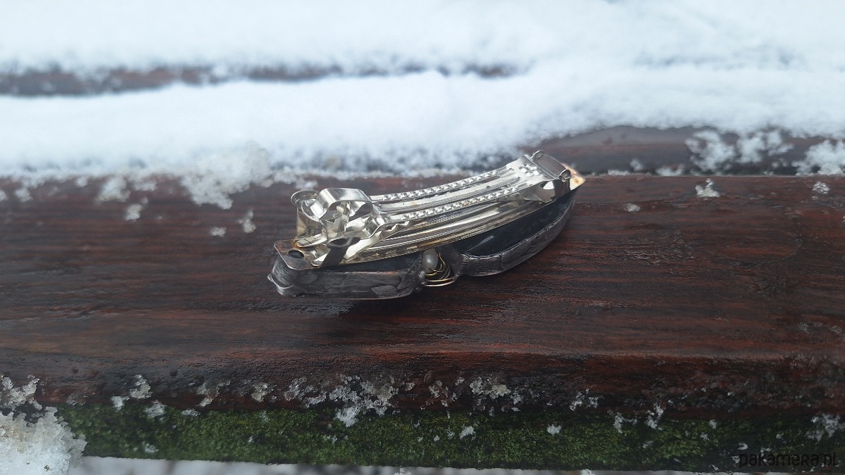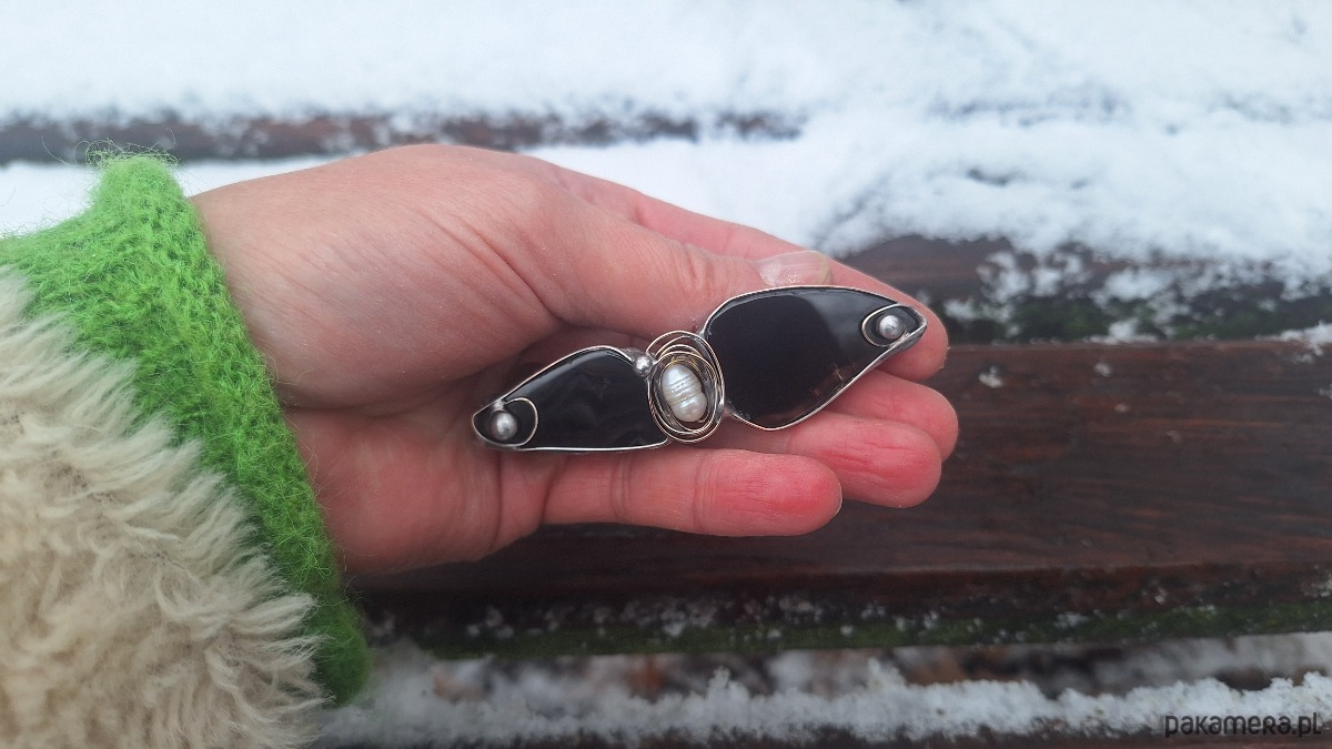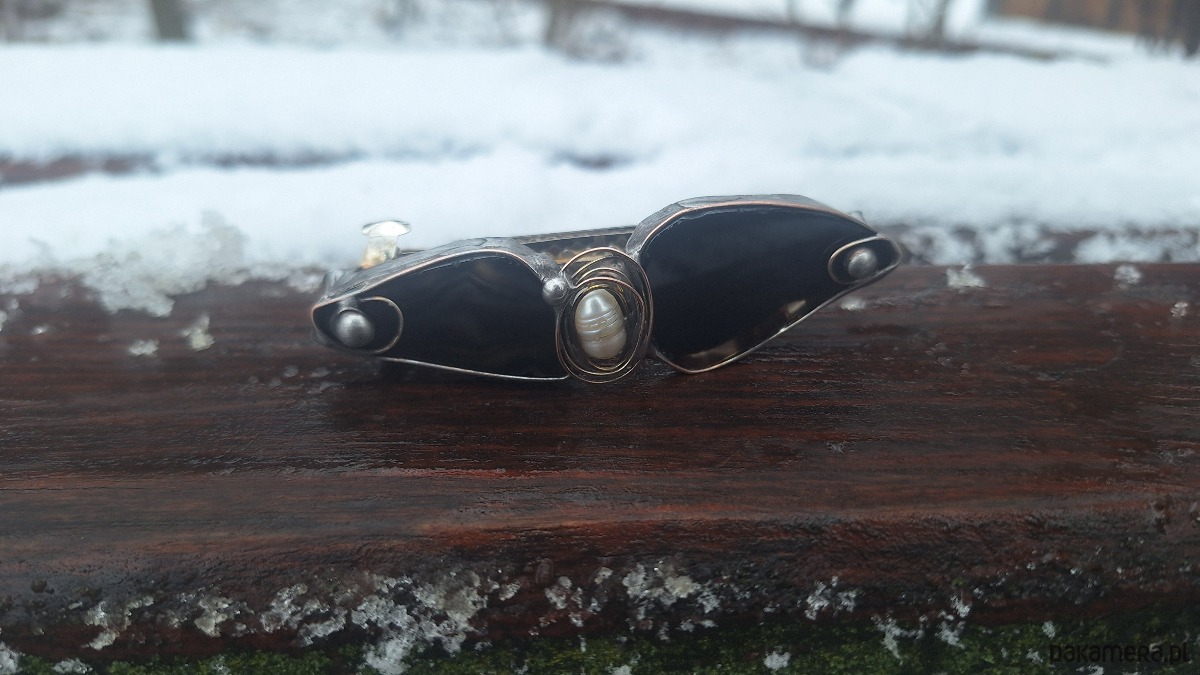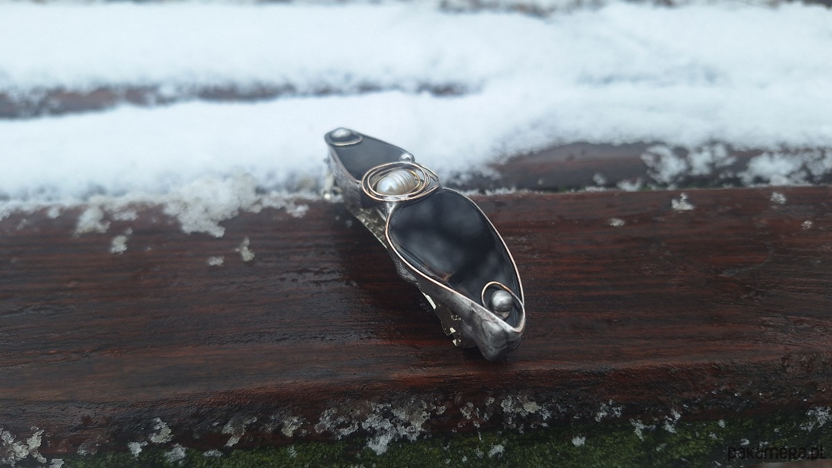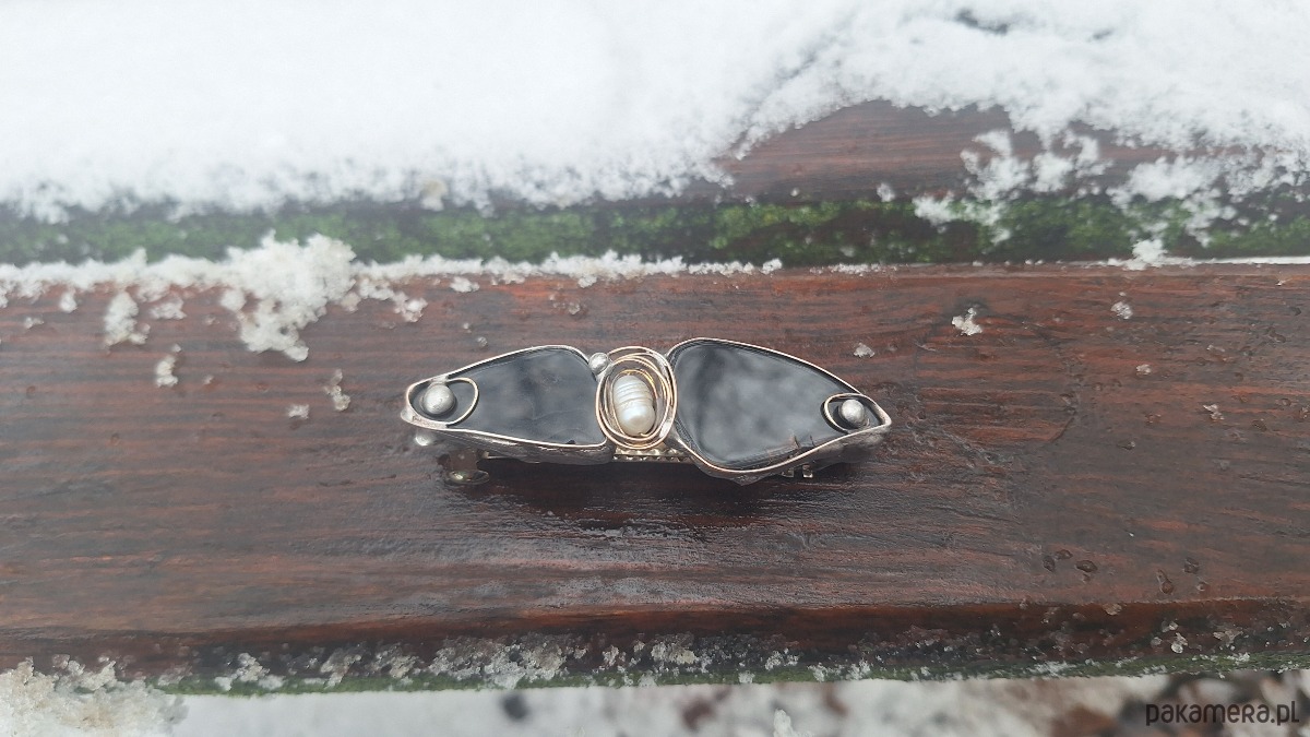 Klamra do włosów, wykonana z miedzi, cyny, agatów i perły. Wymiary ok. 8 na 2.2 cm. Zapięcie 6 cm, metalowe.