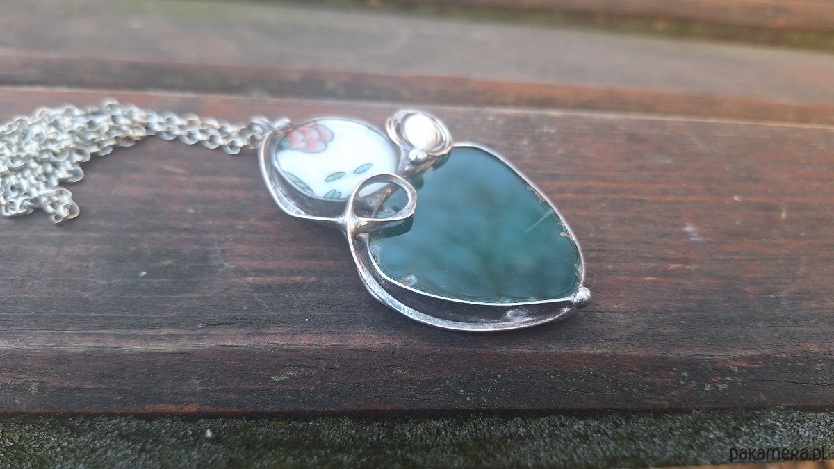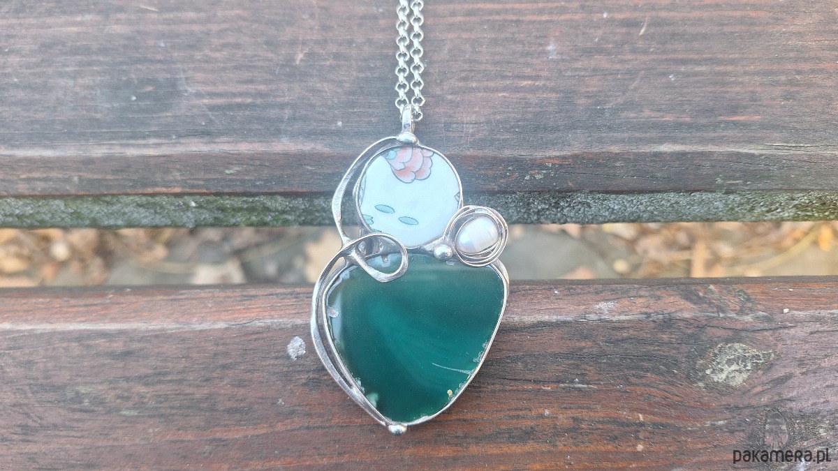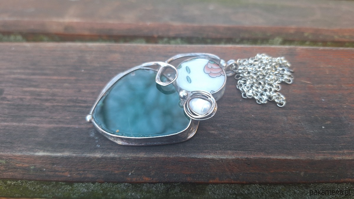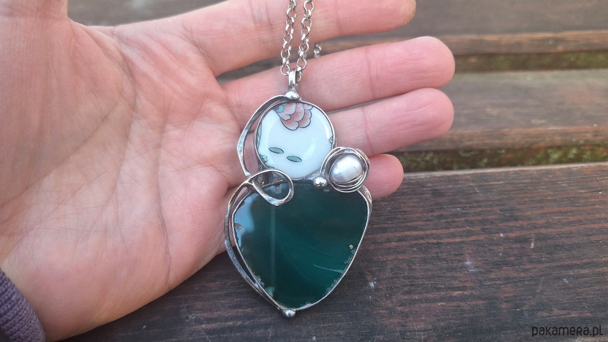 Wisiorek wykonany z miedzi, cyny, perły, ceramiki i agatu. Wymiary ok. 6.5 na 4 cm. Zawieszony na łańcuszku o długości ok. 50 cm.