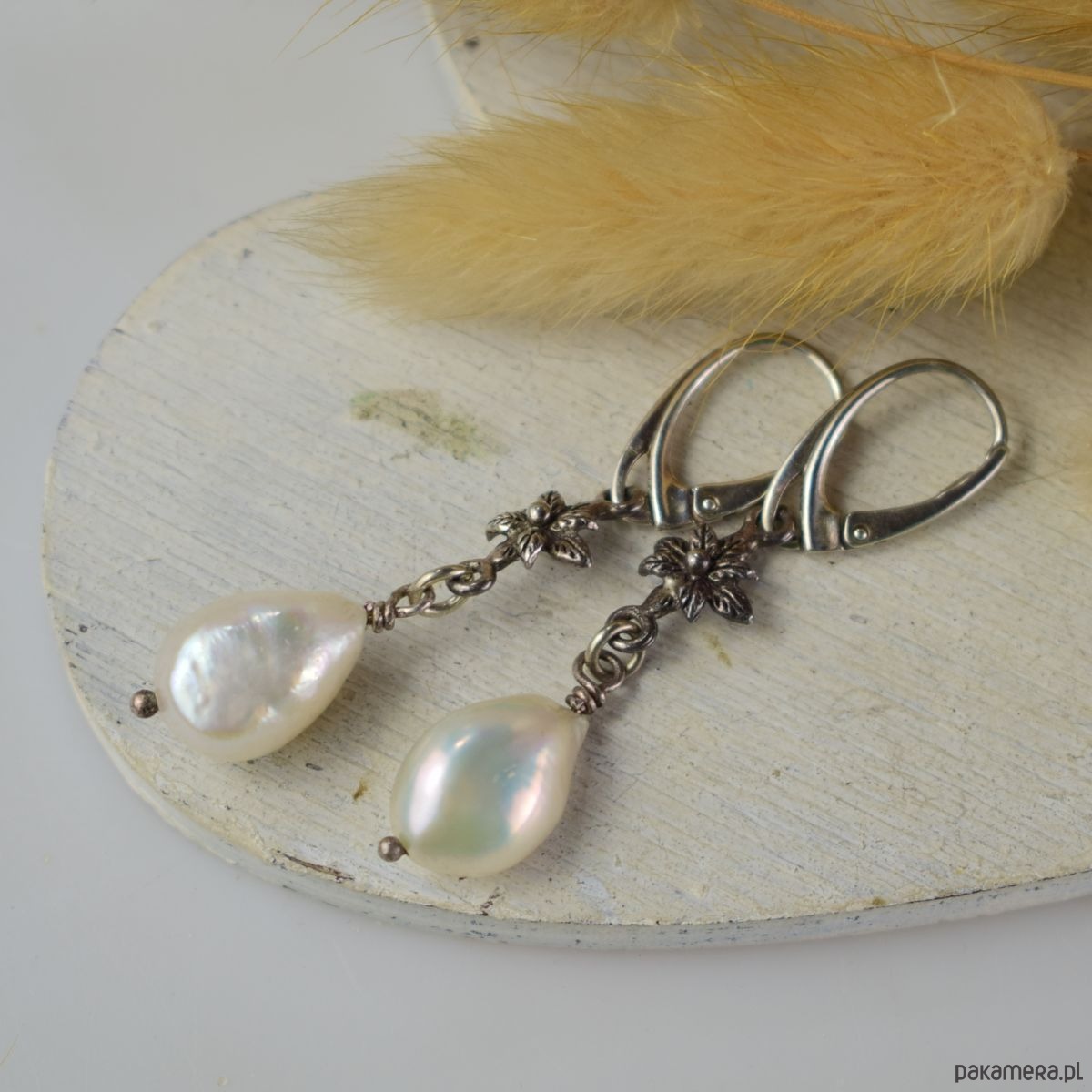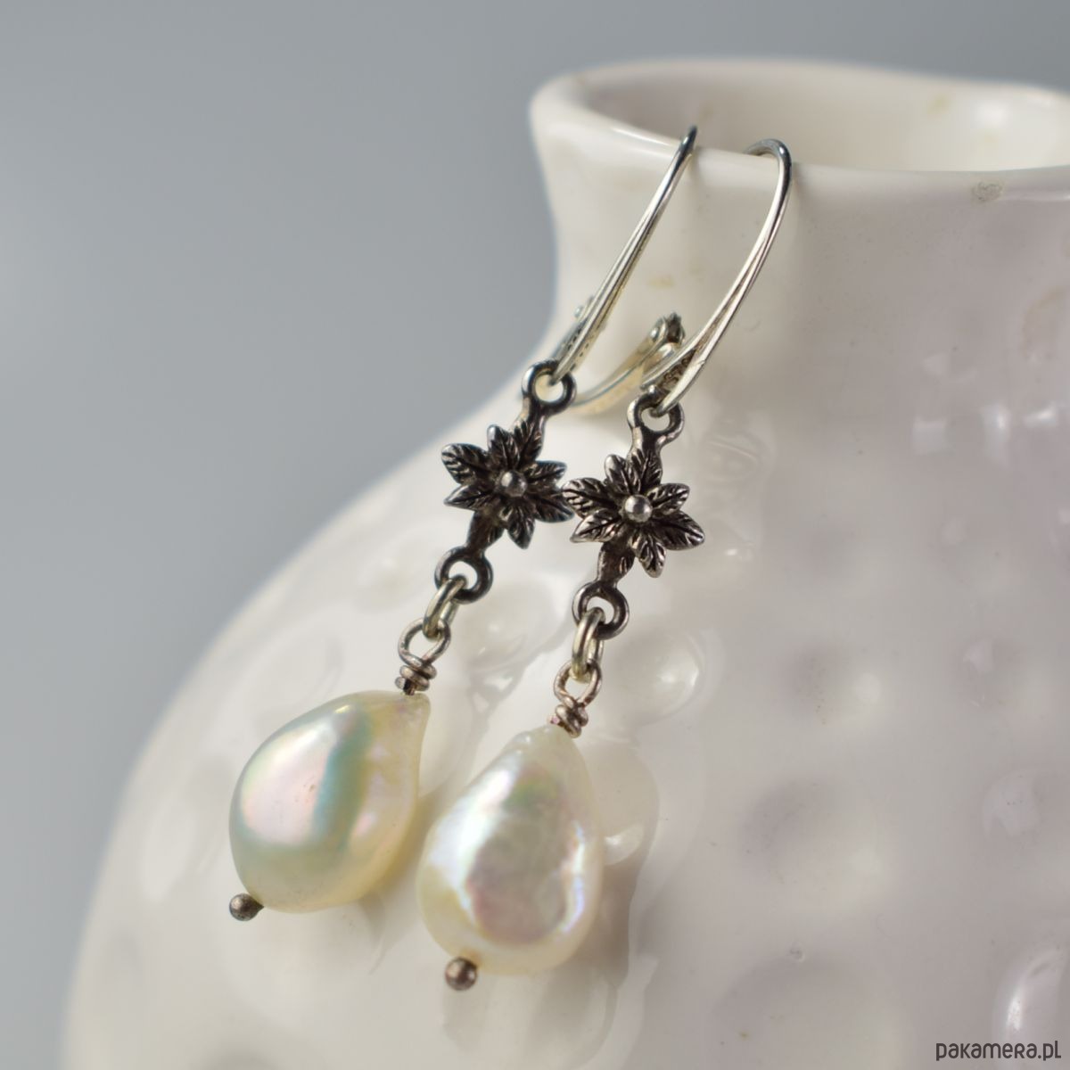 Srebrne kolczyki (srebro 925) z perłami. Biżuteria została zoksydowana i wypolerowana. Długość całego kolczyka 5.2 cm.