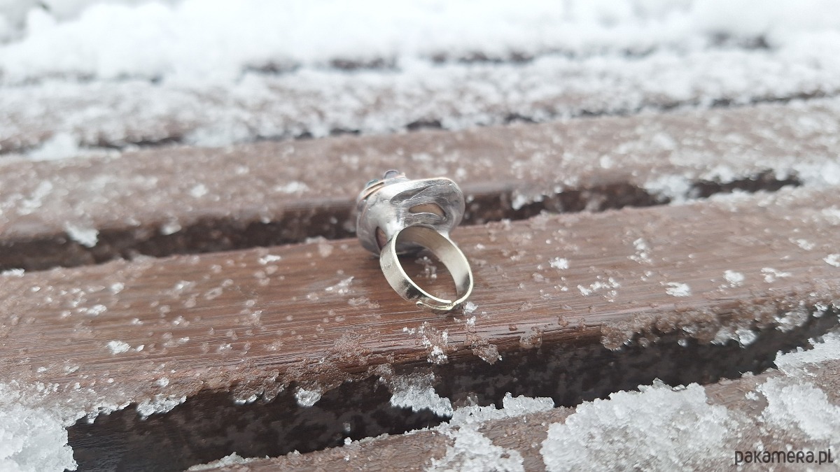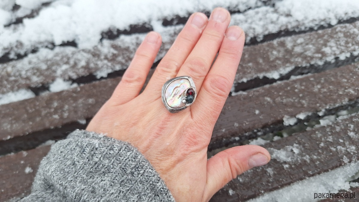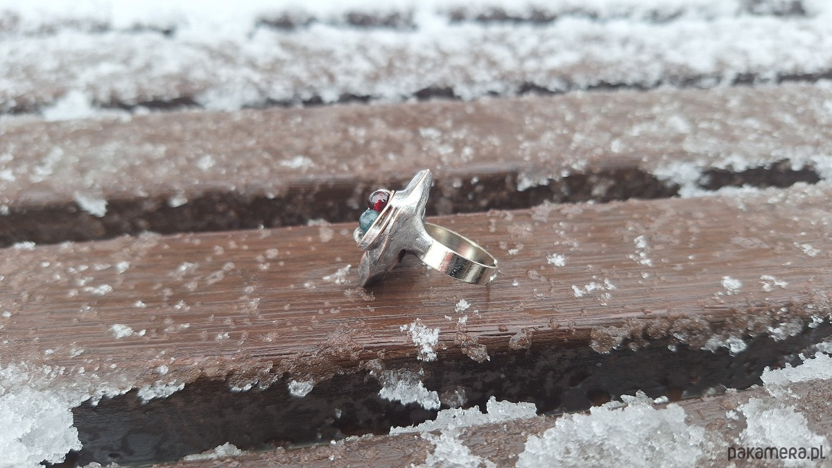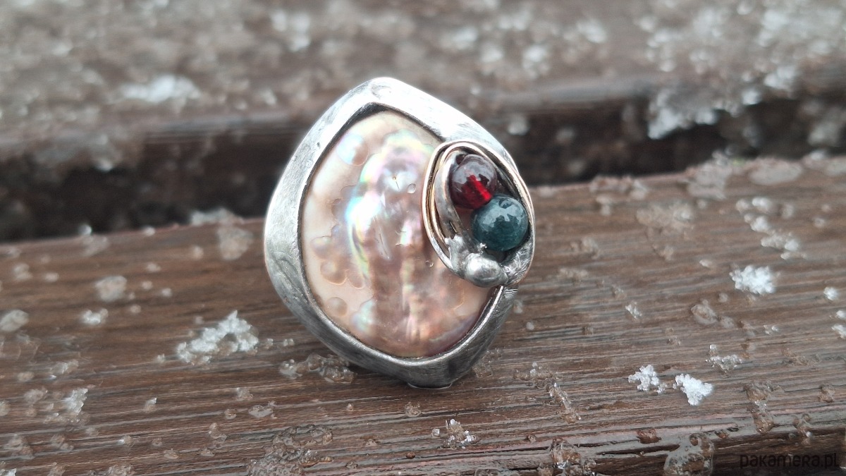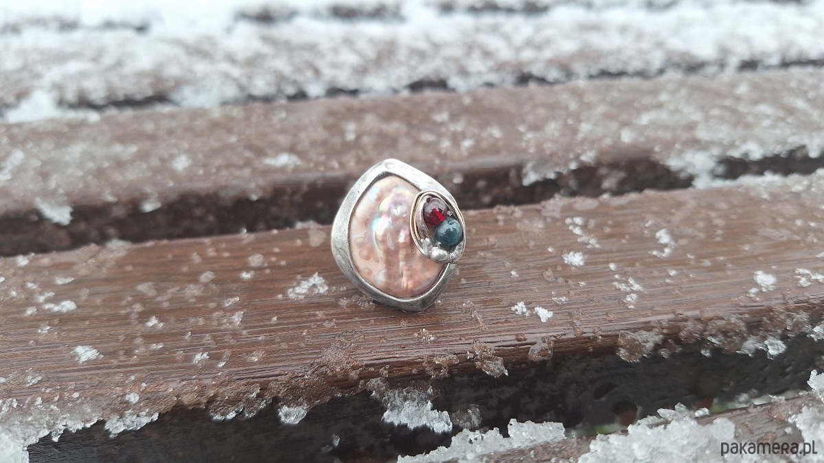 Pierścionek wykonany z miedzi, cyny, turmalinów i perły. Wymiary ok. 2.5 na 2.2 cm. Regulowany. Nie jest ciężki.