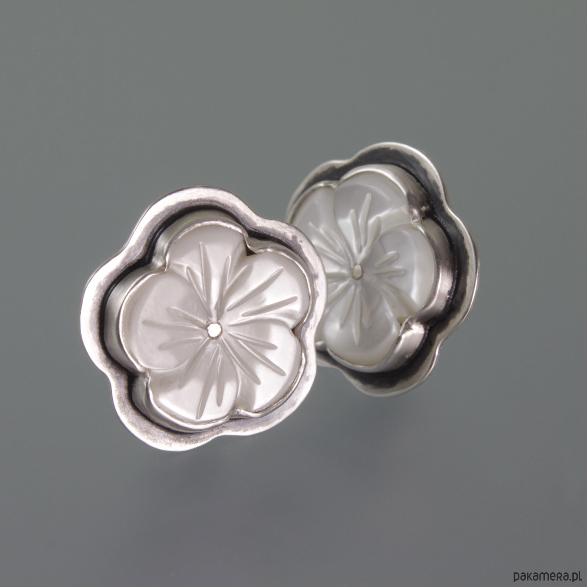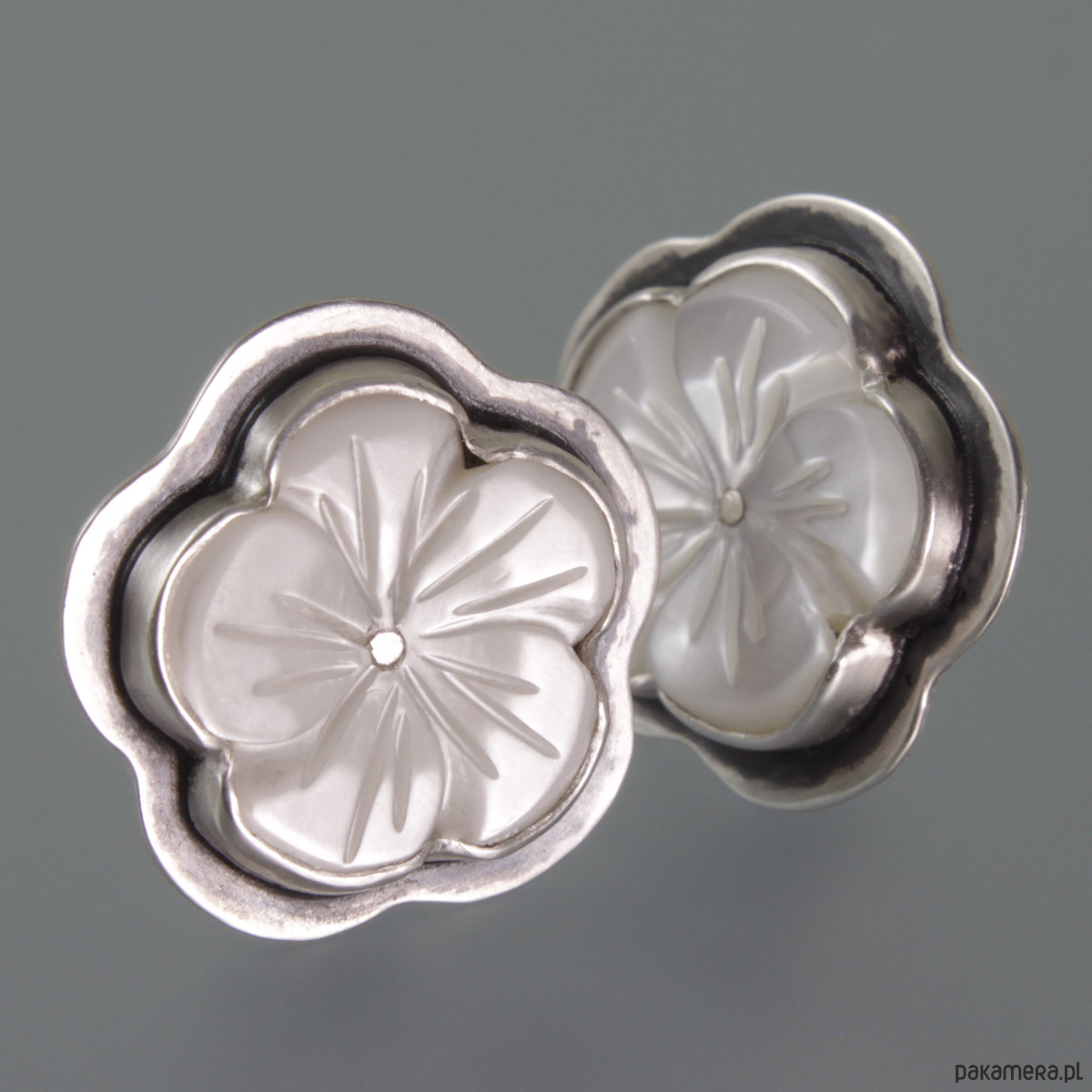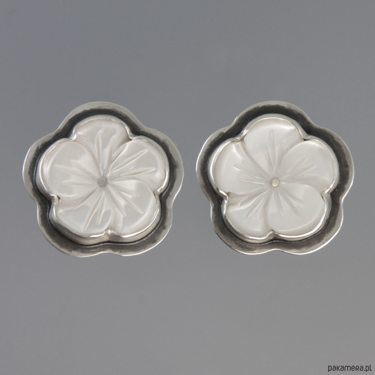 Ręcznie wykonane srebrne klipsy z masy perłowej. Srebro próby 925 - próba wybita na harfie. Średnica klipsów: 2,0 cm. Waga klipsów: 7,3 g.