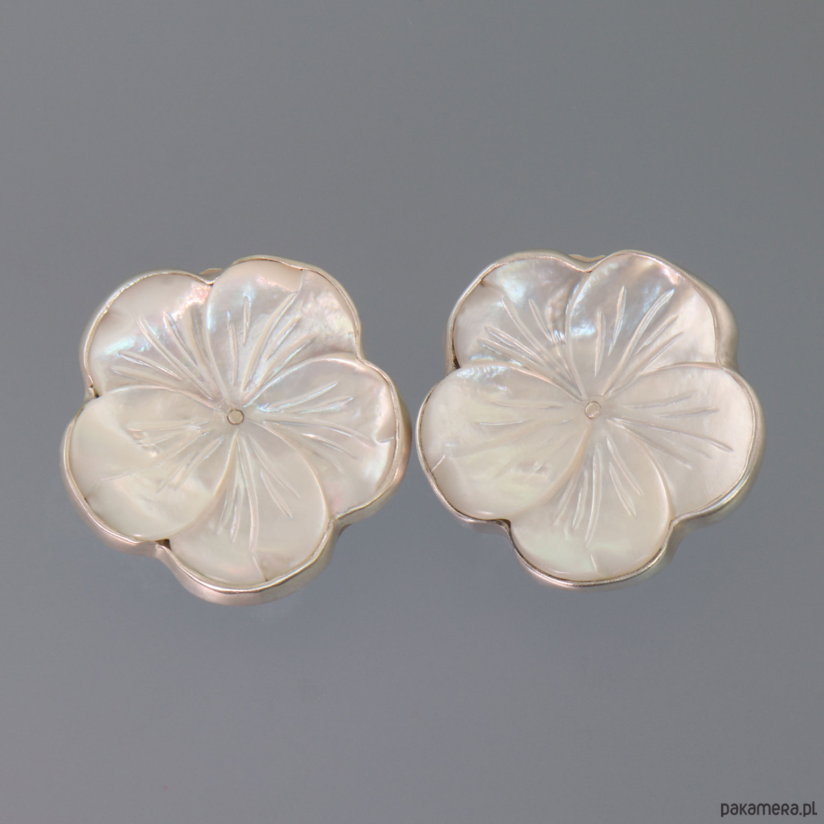 Ręcznie wykonane srebrne klipsy z masy perłowej. Srebro próby 925 - próba wybita na harfie. Średnica klipsów: 2,4 cm. Waga klipsów: 11,7 g.