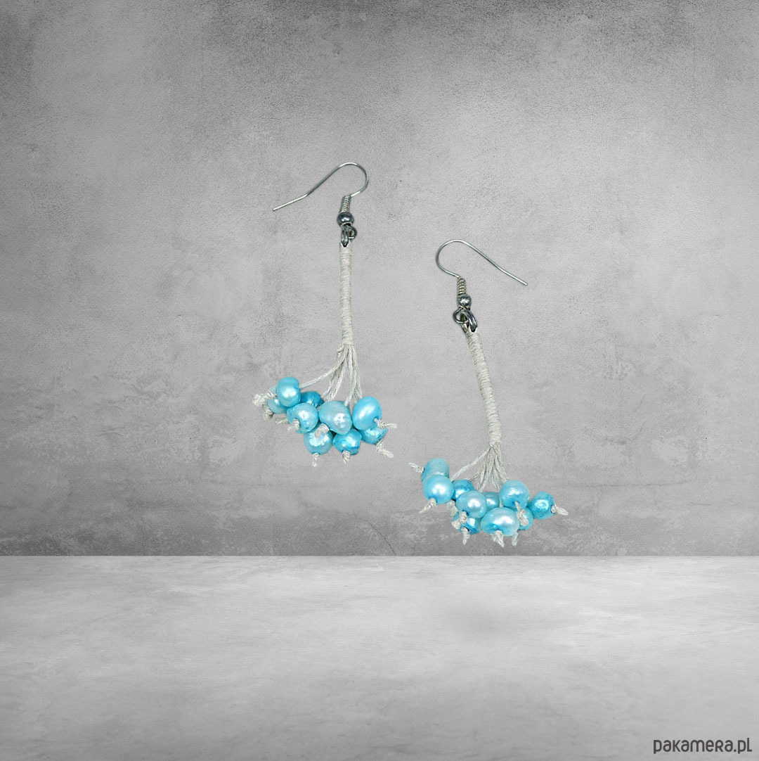 Oryginalne kolczyki wykonane z naturalnego lnu i pereł w kolorze błękitnym