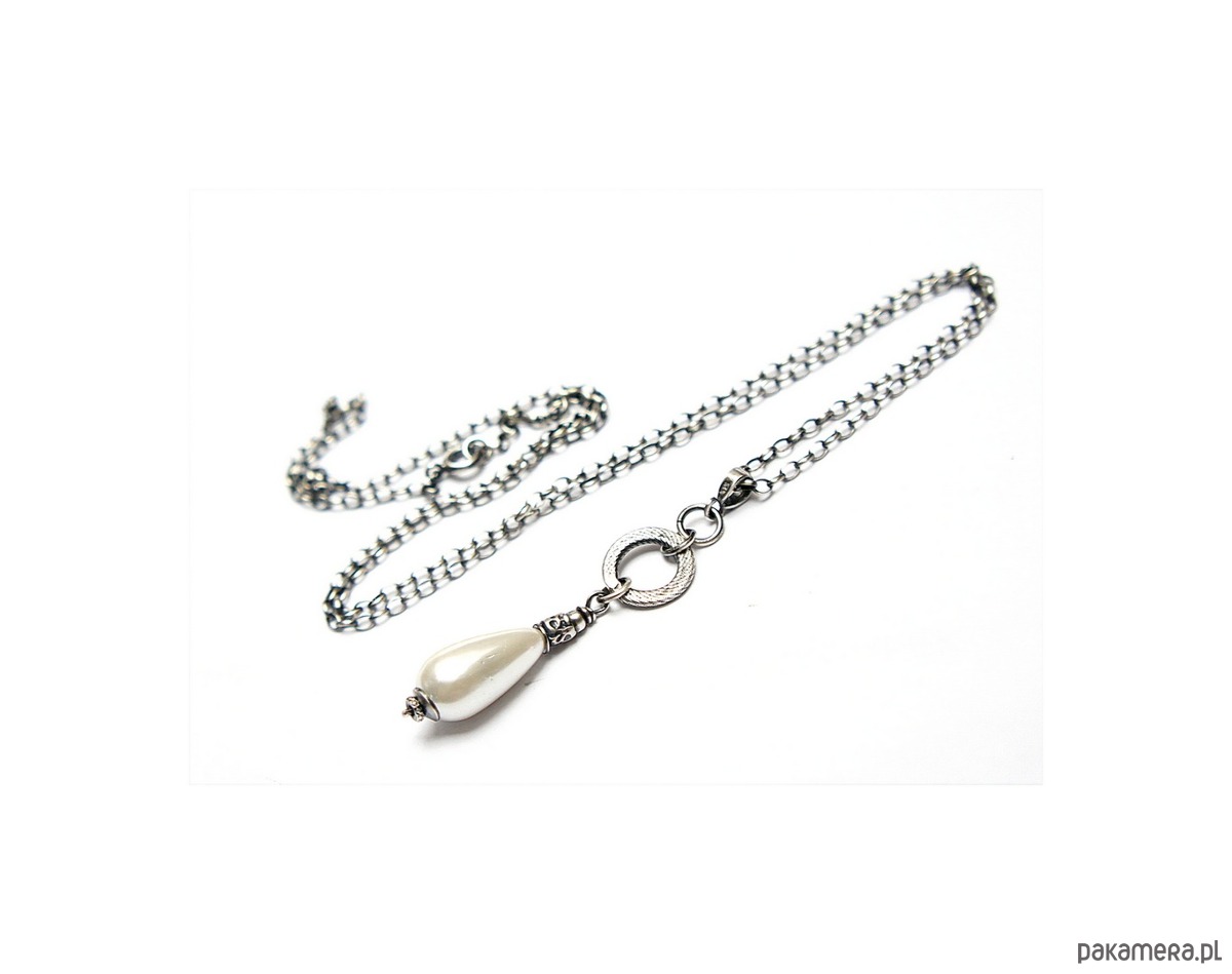 Naszyjnik wykonany ze srebra [pr. 925] w połączeniu z kroplą perły majorka [16mm]. Srebro oksydowane i przetarte. Całkowita długość naszyjnika 55cm. Biżuteria ozdobnie zapakowana.