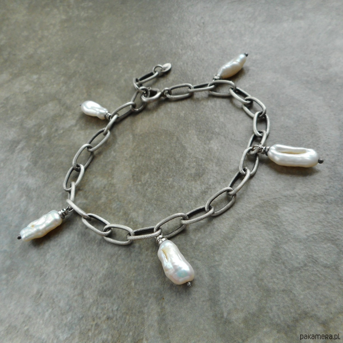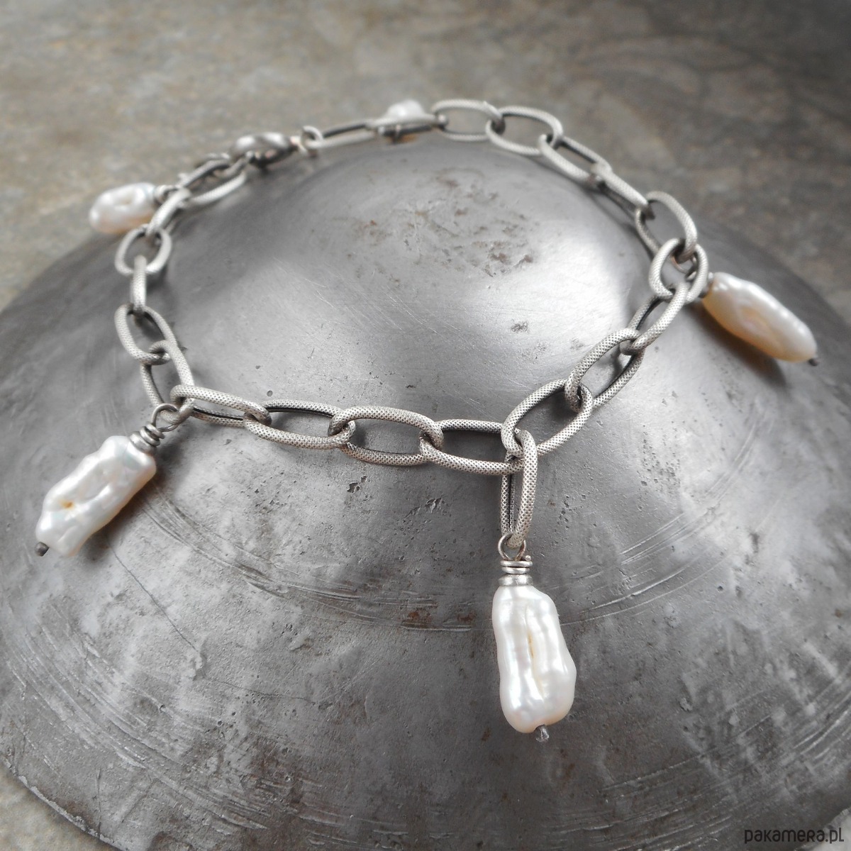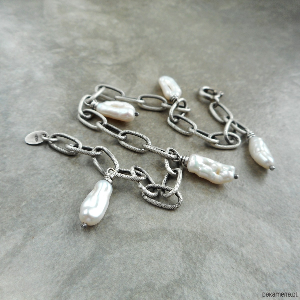 Oryginalna, jedyna bransoletka z kamieni naturalnych i szlachetnego srebra; charakteru biżuterii nadaje połączenie pereł hodowlanych w formie patyczków z fakturowanym, solidnym grubym łańcuchem o dużych oczkach ( 10 mm).