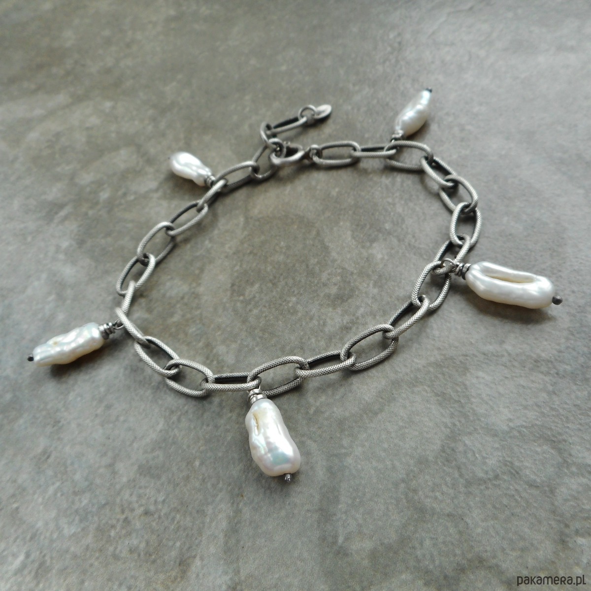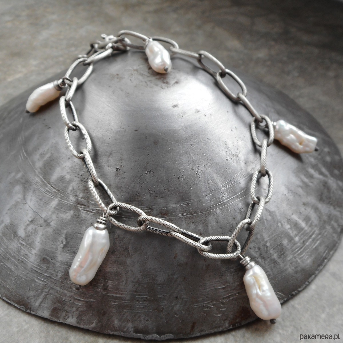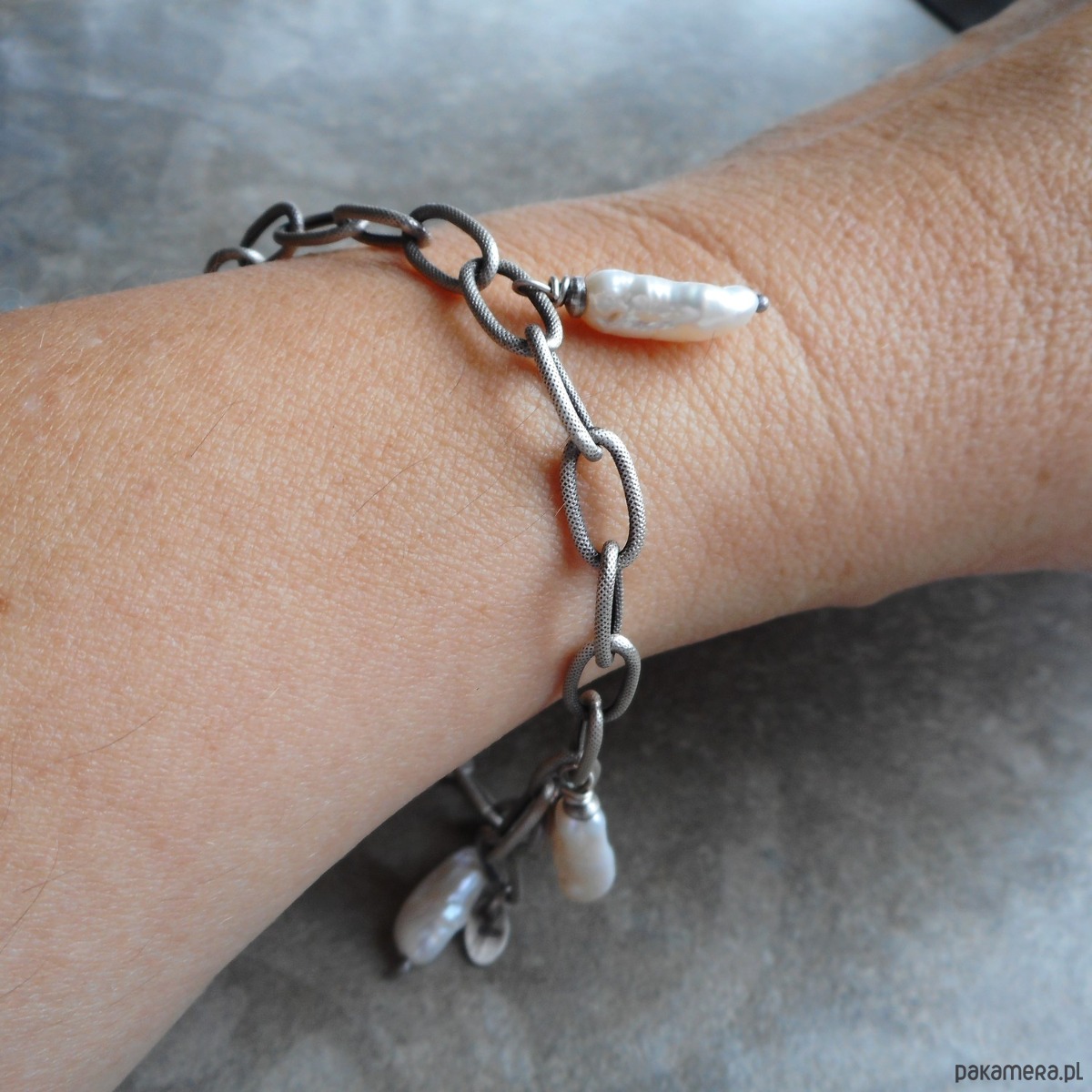 Oryginalna, jedyna bransoletka z kamieni naturalnych i szlachetnego srebra; charakteru biżuterii nadaje połączenie pereł hodowlanych w formie patyczków z fakturowanym, solidnym grubym łańcuchem o dużych oczkach ( 10 mm).