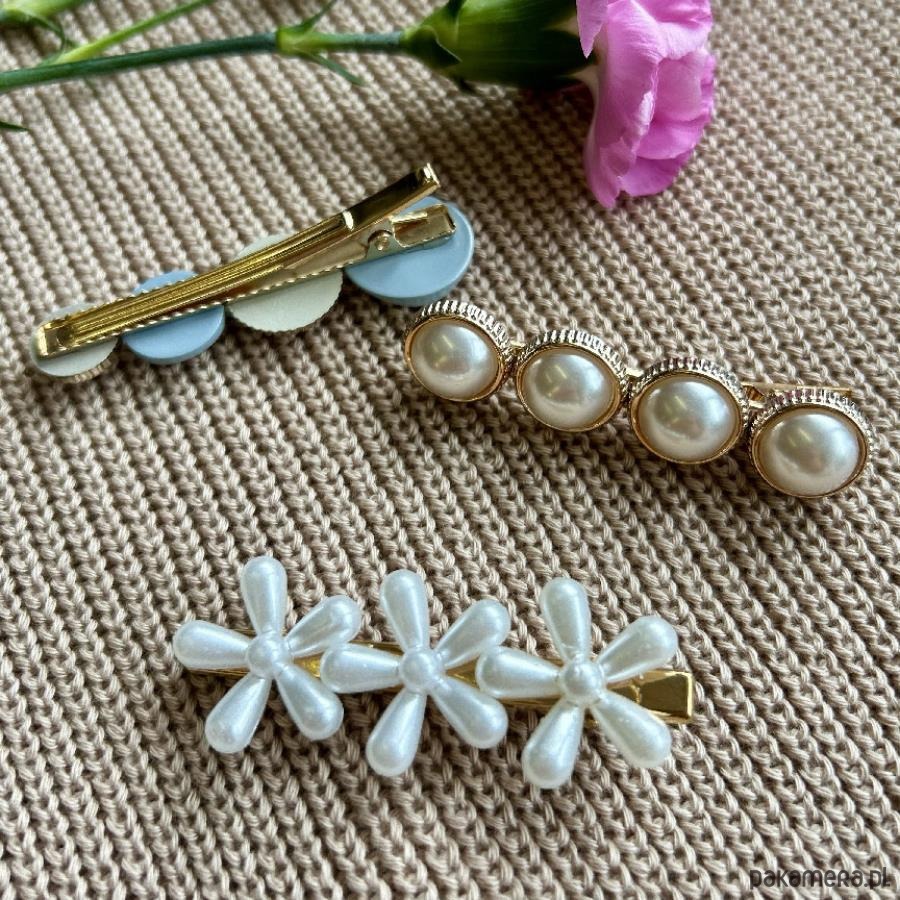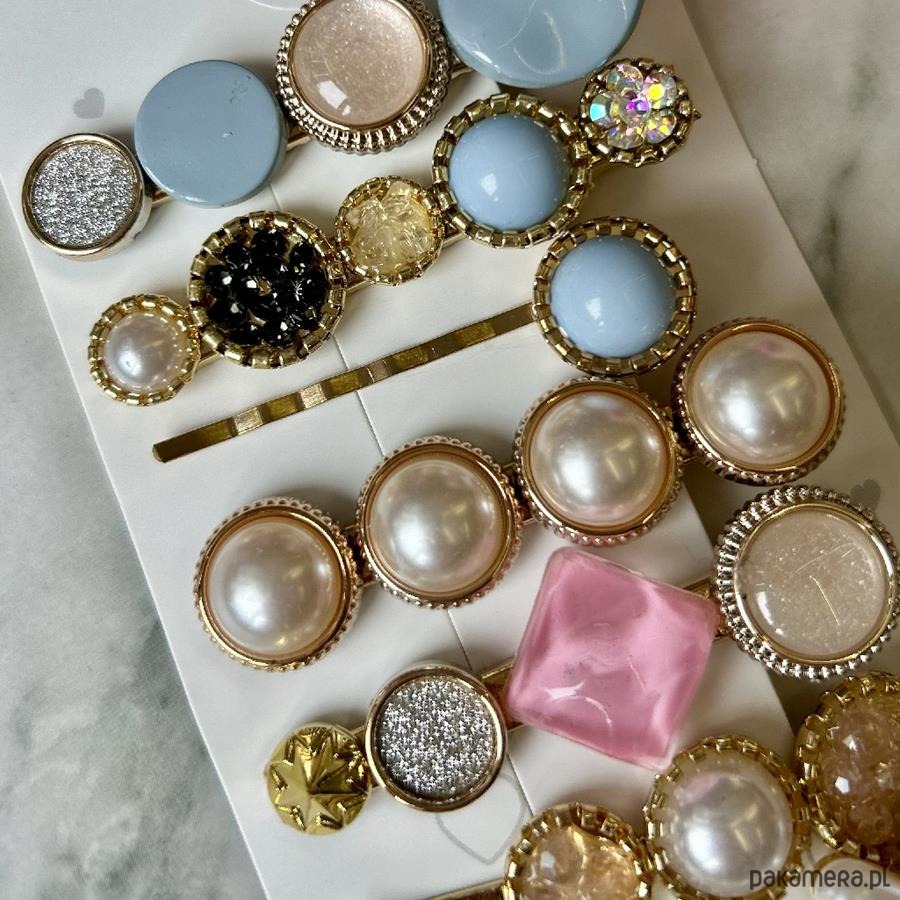 Spinki klamerki 5 sztuk – dobrze trzymające włosy spinki, zapinane jak żabki. Wszystkie spinki swoimi kolorami oraz kształtami świetnie się ze sobą komponują i możesz stworzyć z nich naprawdę wyjątkową fryzure. Ozdoby do włosów posiadają wiele błyszczących jak i modnych elementów, które dodadzą Twoim włosom elegancji i tajemniczości. Największą uwagę z pewnością przyciągają perły złote dodatki. Godne uwagi jest to, że każda ze spinek pasuje do drugiej dzięki czemu stworzysz idealną kompozycję w zależności od kolorystyki danego stroju. Dzięki mocnemu zapięciu każda ze spinek będzie idealnie trzymać się Twoich włosów i sprawi, że fryzura wytrzyma nawet całodzienną albo całonocną imprezę.