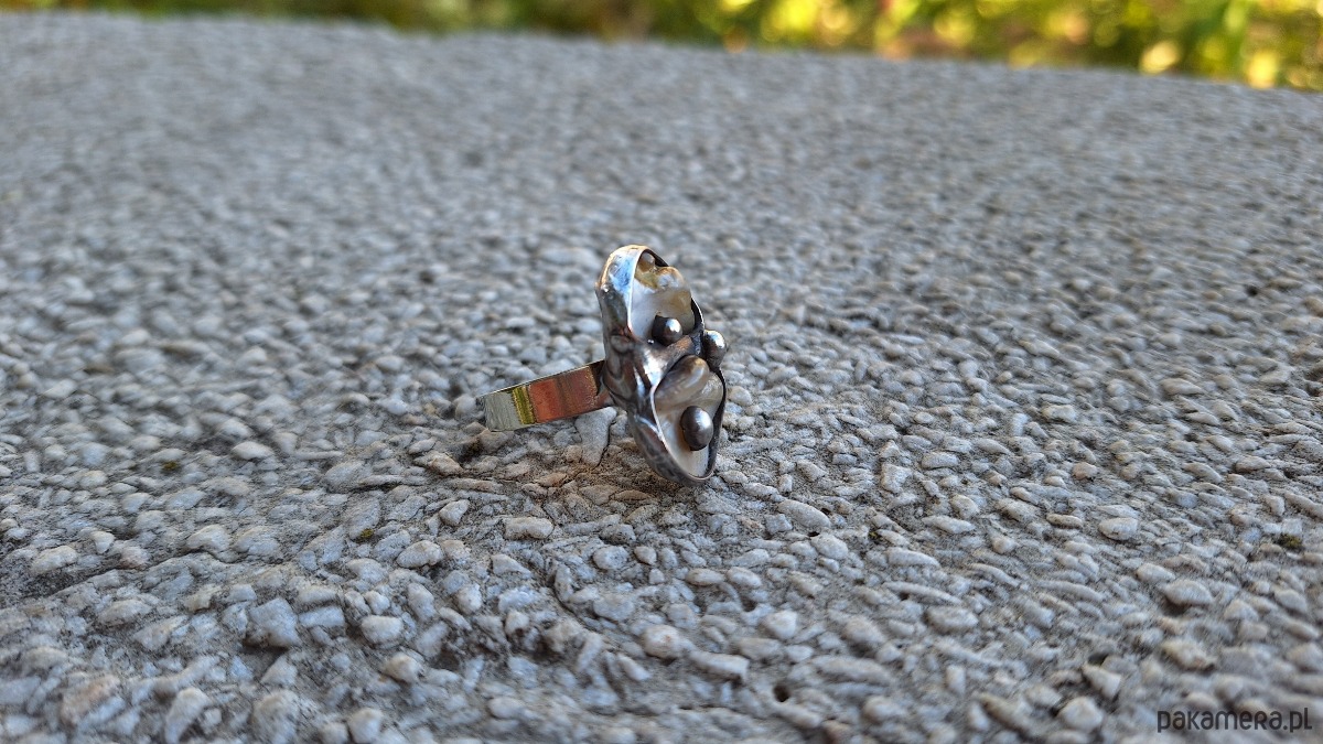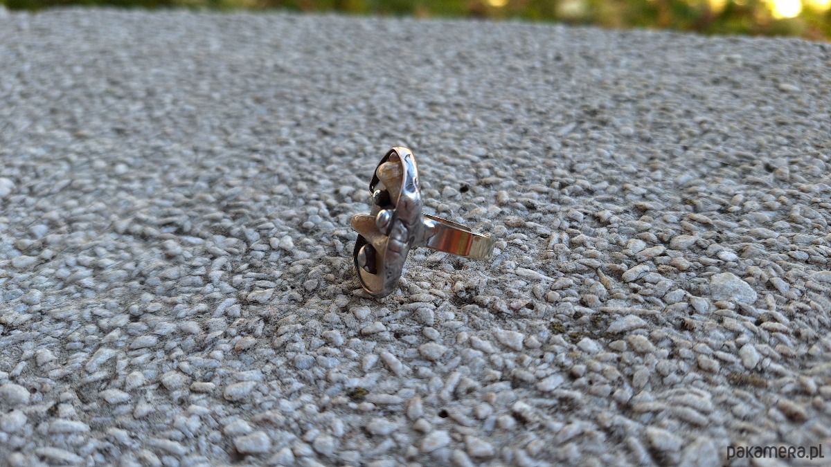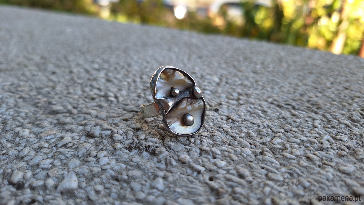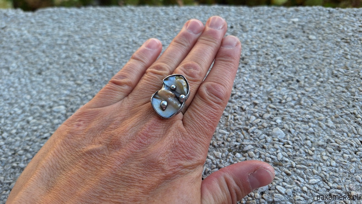 Pierścionek wykonany z miedzi, cyny i masy perłowej. Wymiary ok. 2.5 na 1.5 cm. Regulowany. Nie jest ciężki.