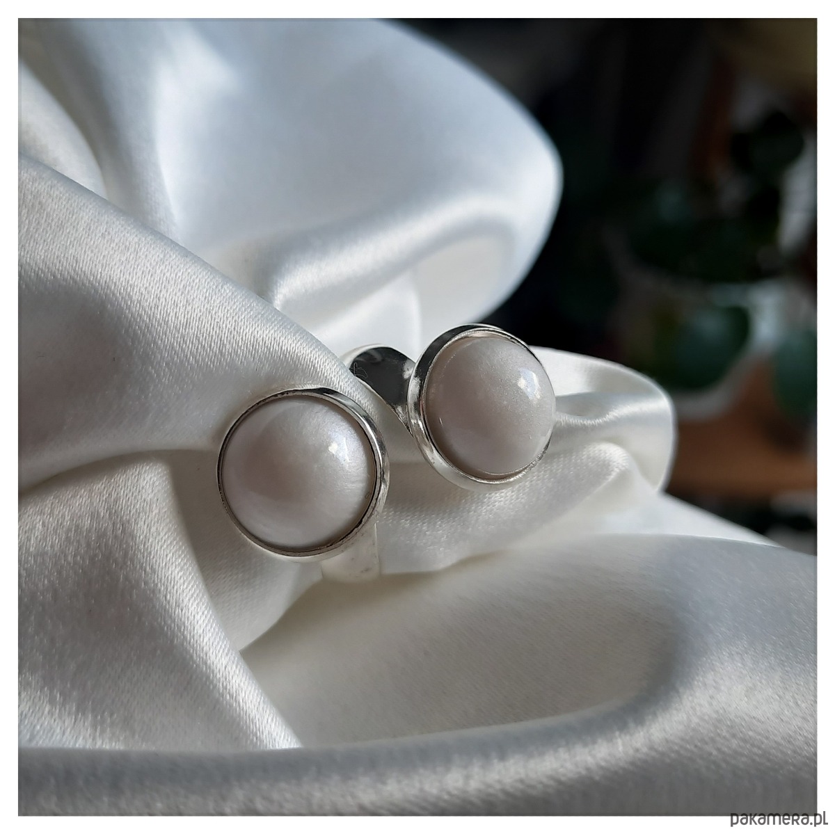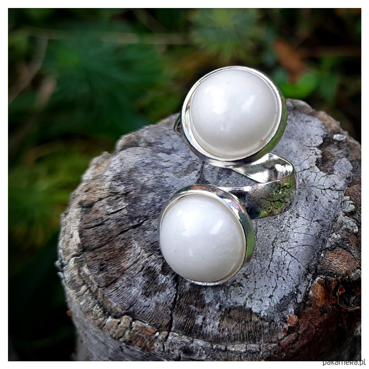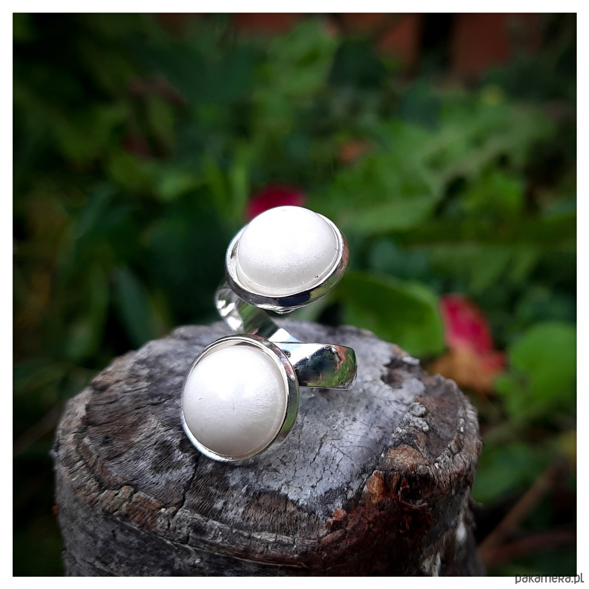 Pierścionek z podwójnym oczkiem z zatopionym w żywicy epoksydowej oczkiem z perłowego barwnika.