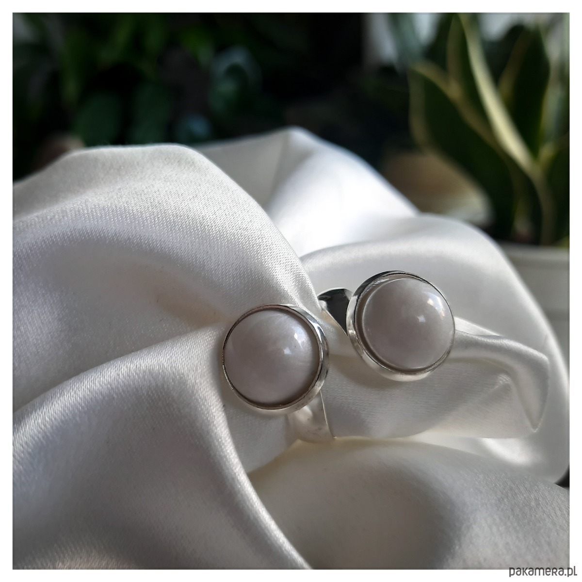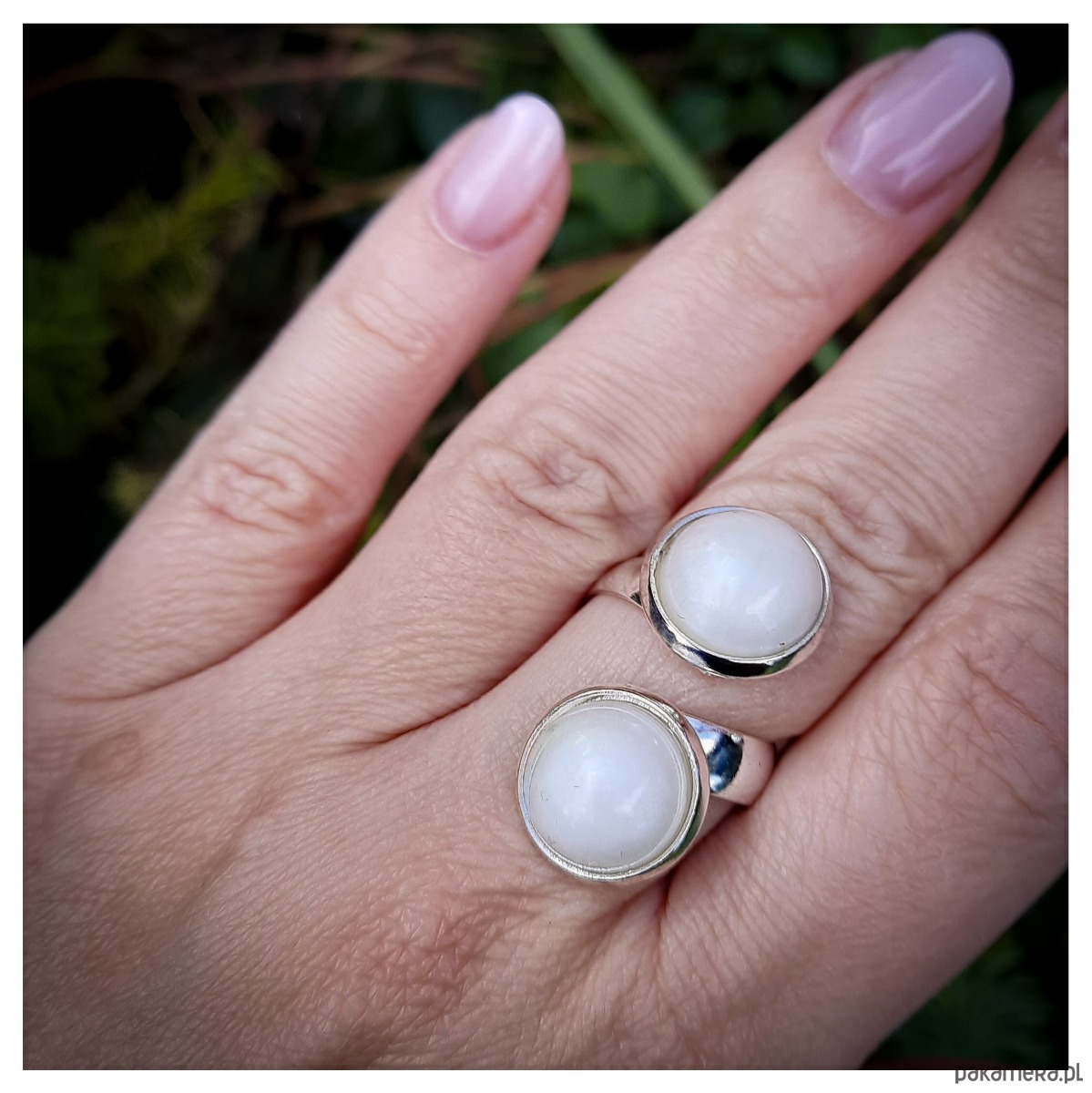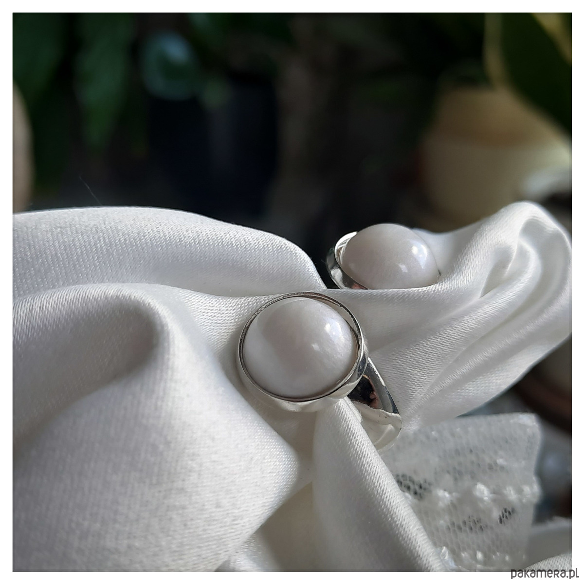 Pierścionek z podwójnym oczkiem z zatopionym w żywicy epoksydowej oczkiem z perłowego barwnika.