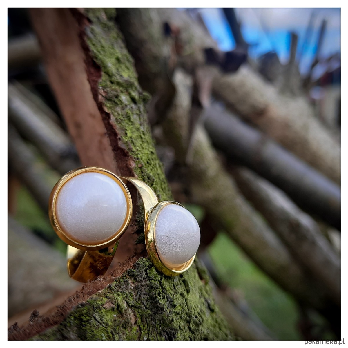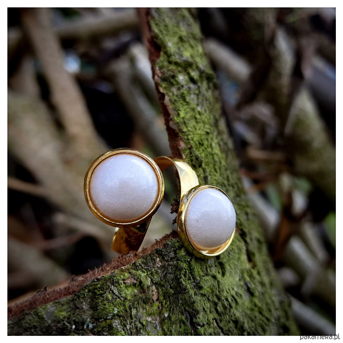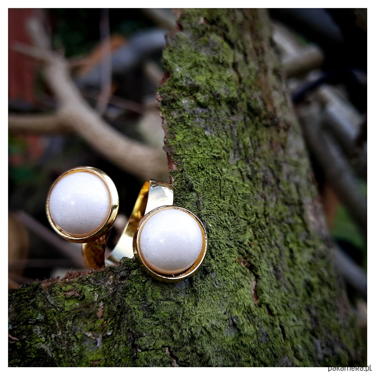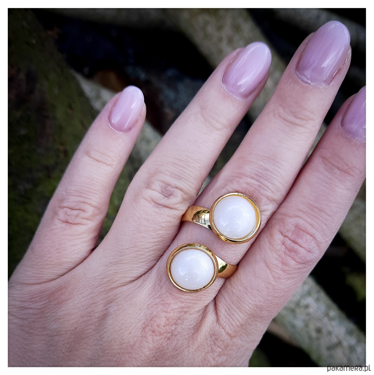 Pierścionek z podwójnym oczkiem z zatopionym w żywicy epoksydowej oczkiem z perłowego barwnika.