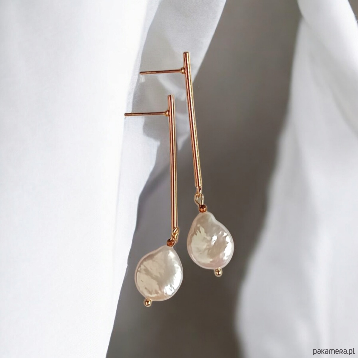 TUTAJ: długie, lekkie kolczyki wykonane z przepięknych, pereł hodowlanych w klasycznym odcieniu złamanej bieli, z dodatkiem przekładek ze złotego hematytu.