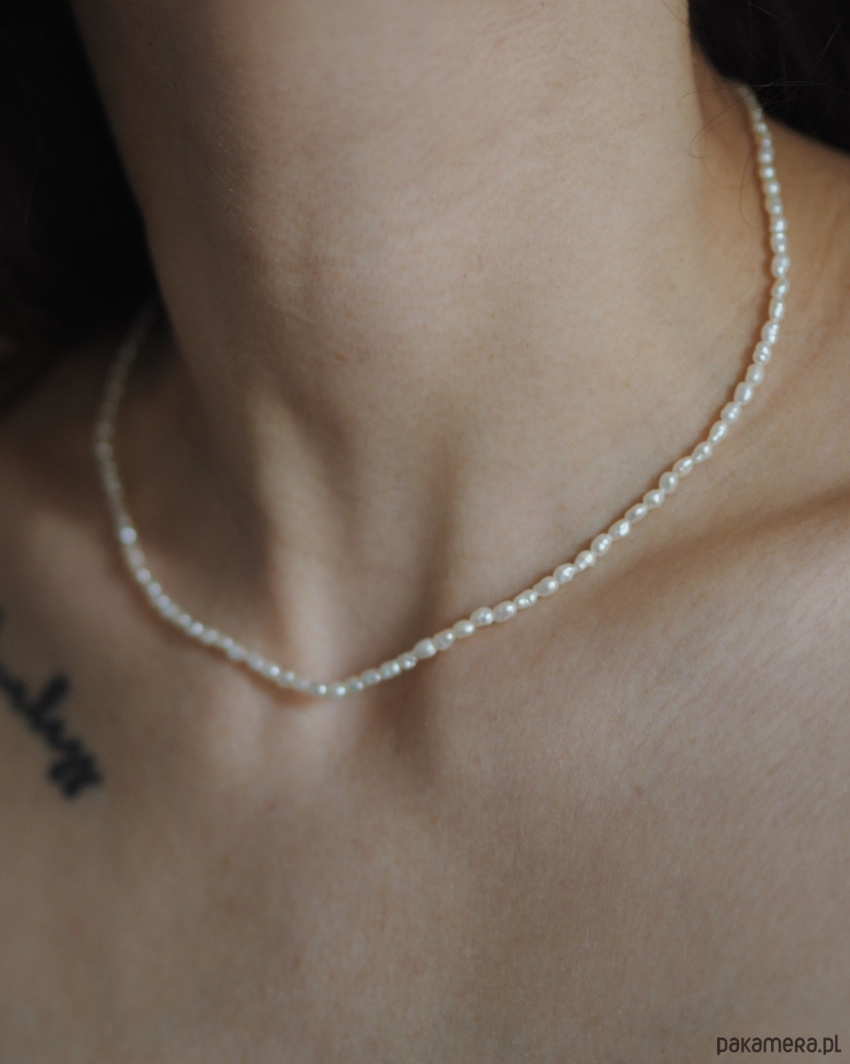 Naszyjnik został wykonany z drobnych, naturalnych pereł słodkowodnych o nieregularnym kształcie.