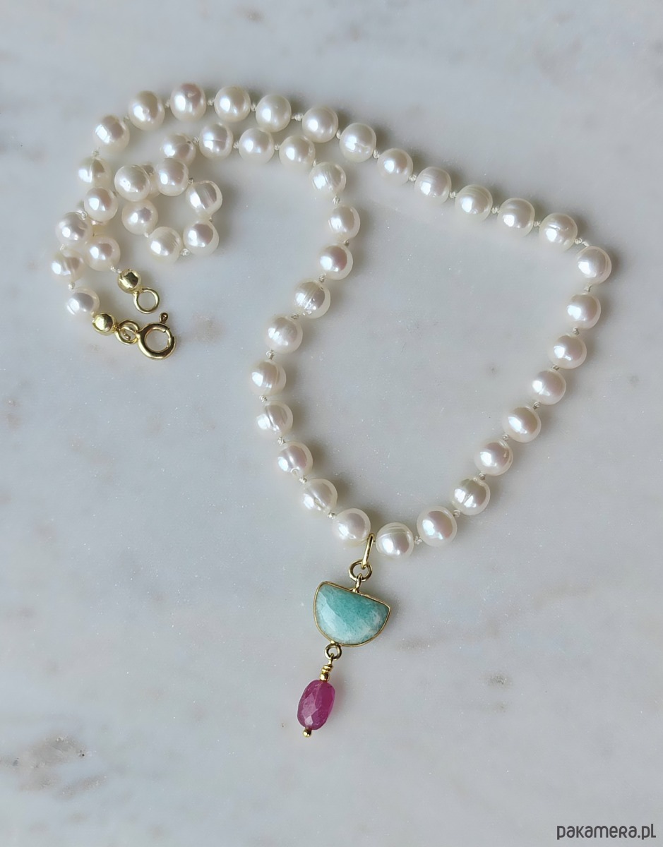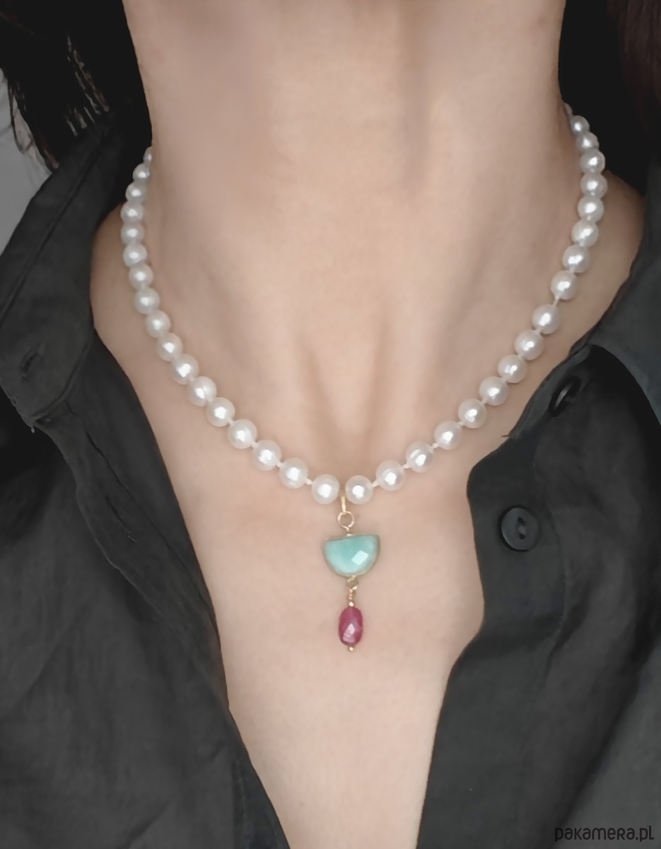 Sznur klasycznych, białych pereł na jedwabnej, supełkowanej nici. Wyjątkowa zawieszka z delikatnym amazonitem oraz wyrazistym, lśniącym szafirem dodaje wyjątkowości. Klasyka z domieszką ekstrawagancji.