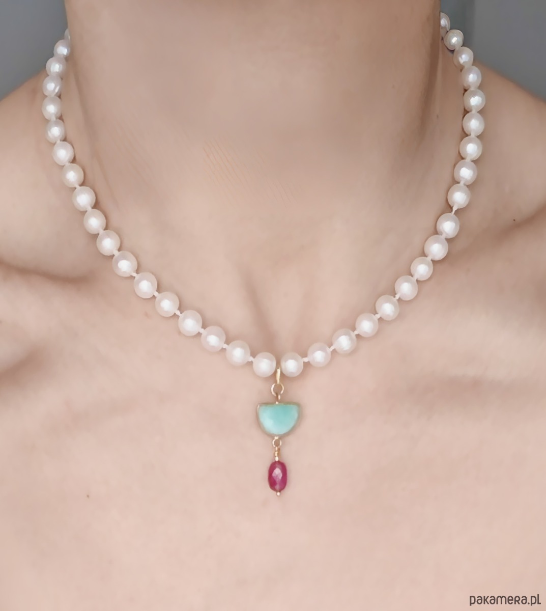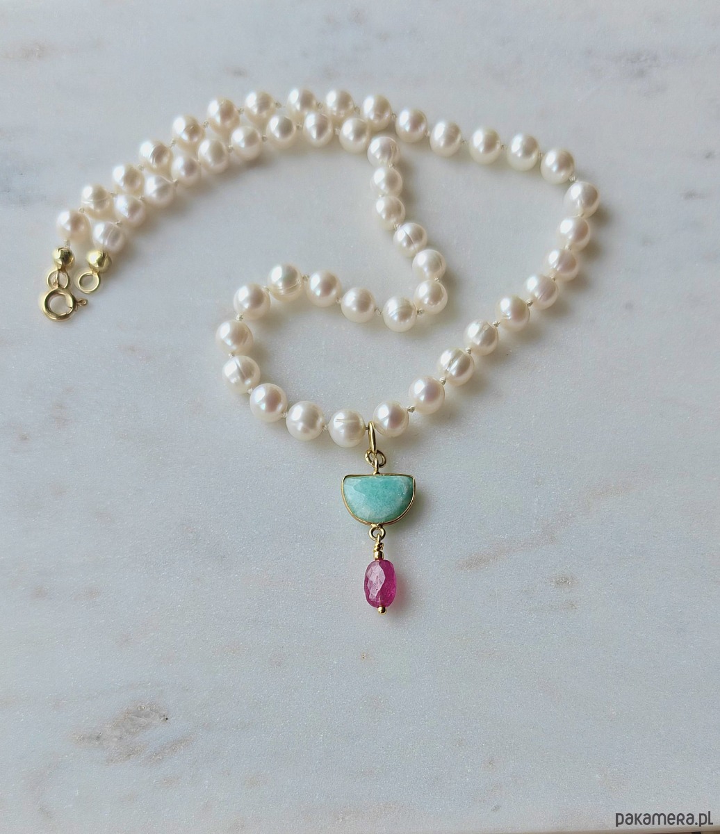 Sznur klasycznych, białych pereł na jedwabnej, supełkowanej nici. Wyjątkowa zawieszka z delikatnym amazonitem oraz wyrazistym, lśniącym szafirem dodaje wyjątkowości. Klasyka z domieszką ekstrawagancji.
