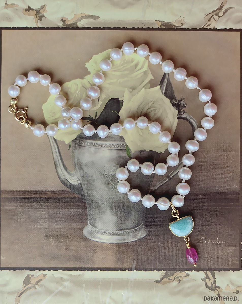 Sznur klasycznych, białych pereł na jedwabnej, supełkowanej nici. Wyjątkowa zawieszka z delikatnym amazonitem oraz wyrazistym, lśniącym szafirem dodaje wyjątkowości. Klasyka z domieszką ekstrawagancji.